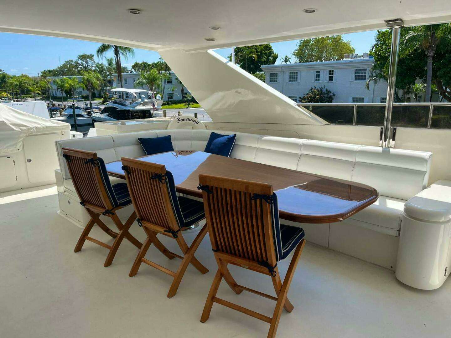 Sanctuary is a raised pilothouse design with walk-around decks, four staterooms and three cabins for crew. Galley / Country Kitchen is forward on the main deck. Â Aft on the main deck is a generous salon with a dining area forward and lounge / social area aft.