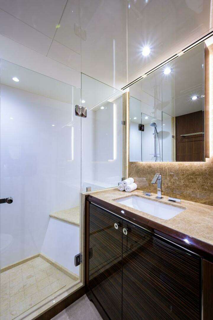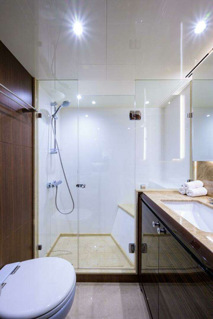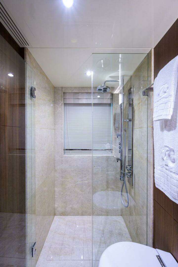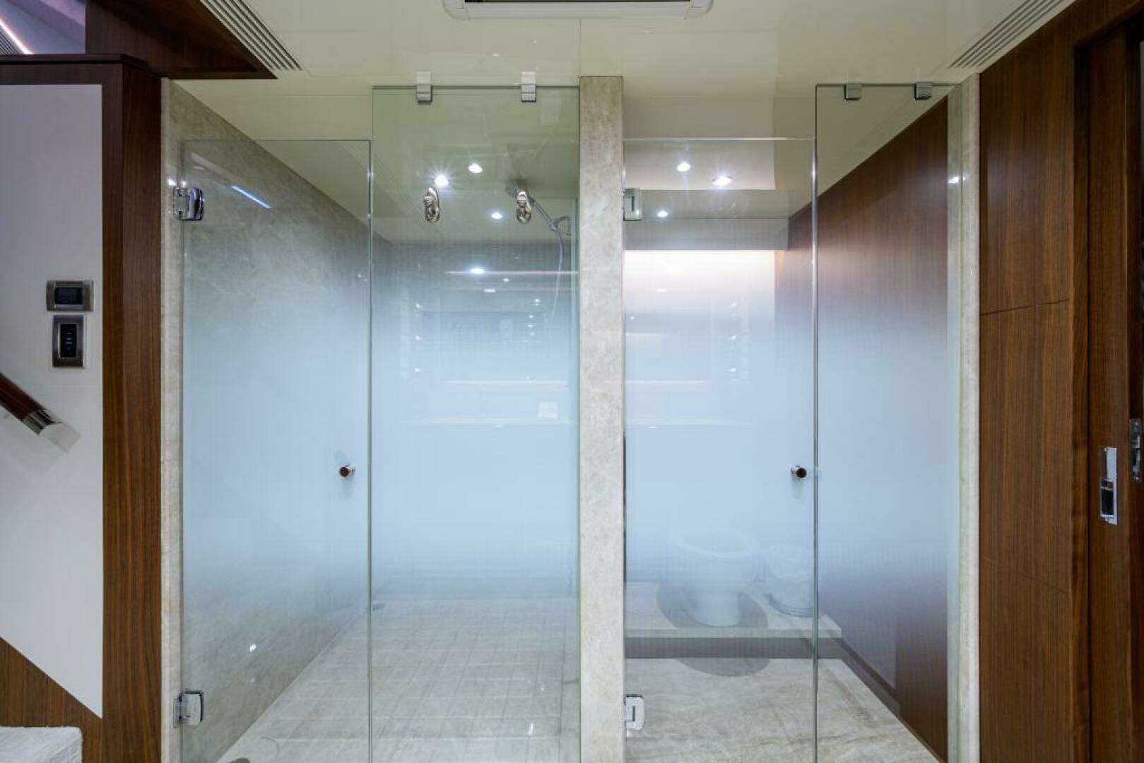 - Shower door w/stone frame. The shower door shall use “crystal clear” glass custom-made for Ocean Alexander. Providing superior transparency and reflectiveness. Together with custom made for Ocean Alexander “minimalist and transparent water strips” provides a unique Ocean Alexander proprietary “Crystal Shower”