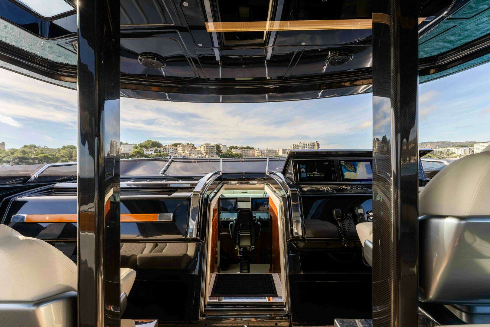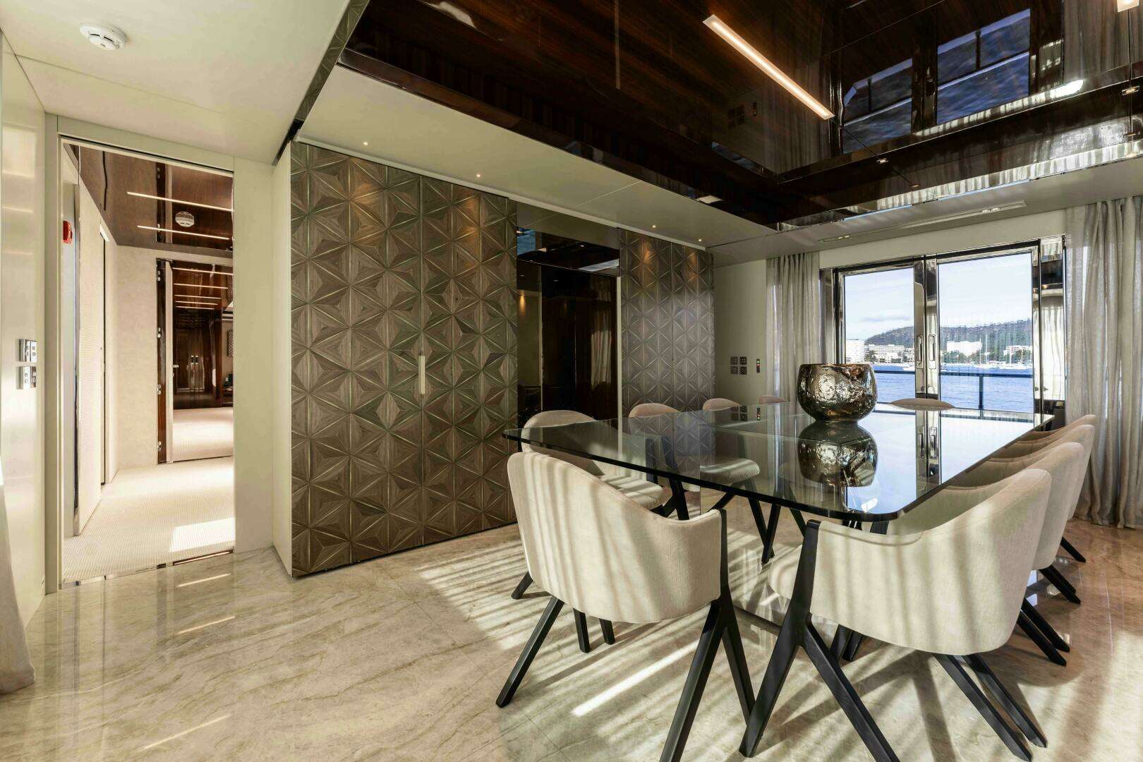 Riva’s reputation for combining speed, luxury and engineering refinement is fully expressed in ELYSIUM I. Beneath the GRP skin of her superstructure sits a stainless-steel structural framework, allowing for exceptionally large main-deck windows with minimal vertical pillars. The result is a main salon flooded with natural light and uninterrupted sea views, more akin to a contemporary waterfront apartment than a traditional flybridge yacht.