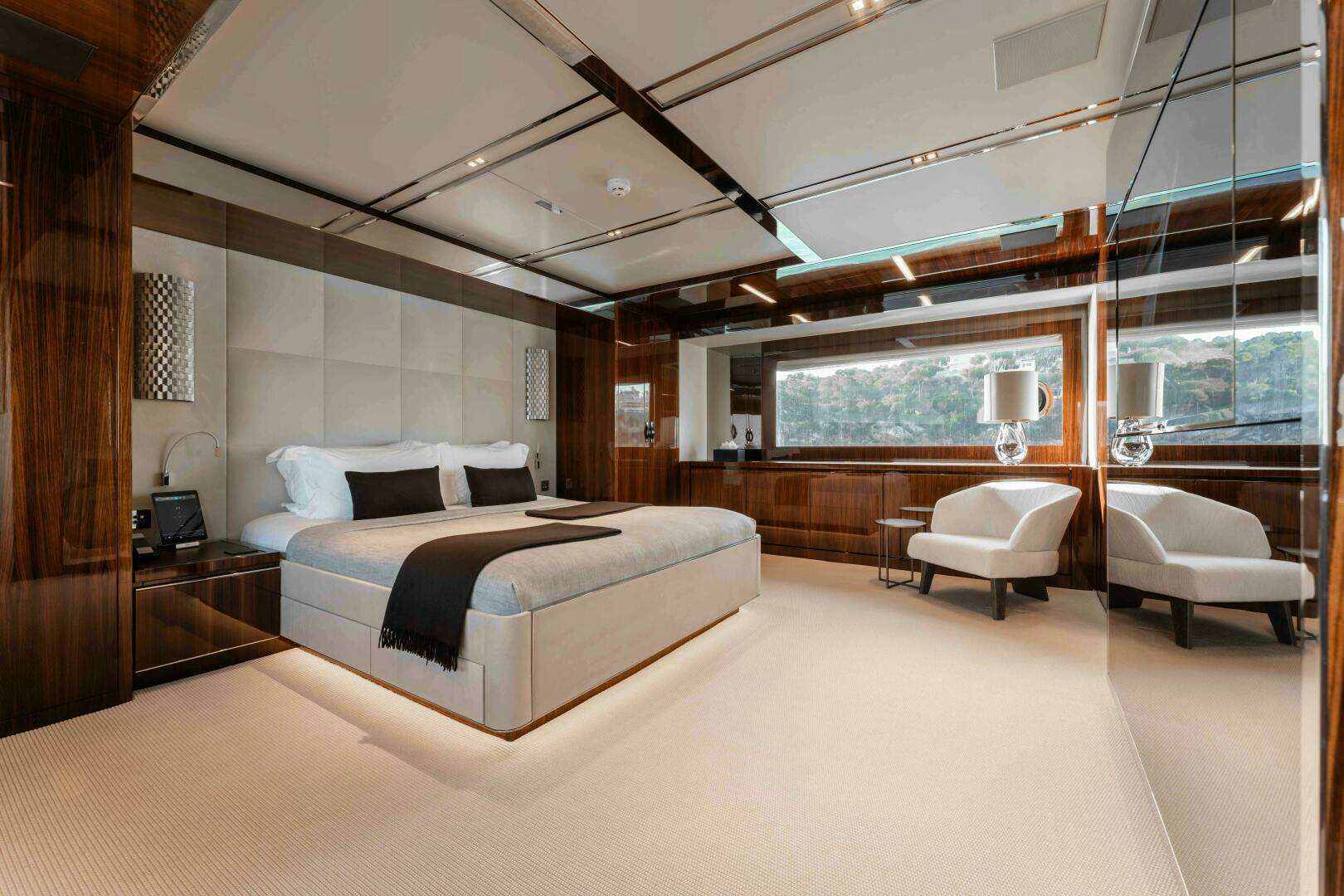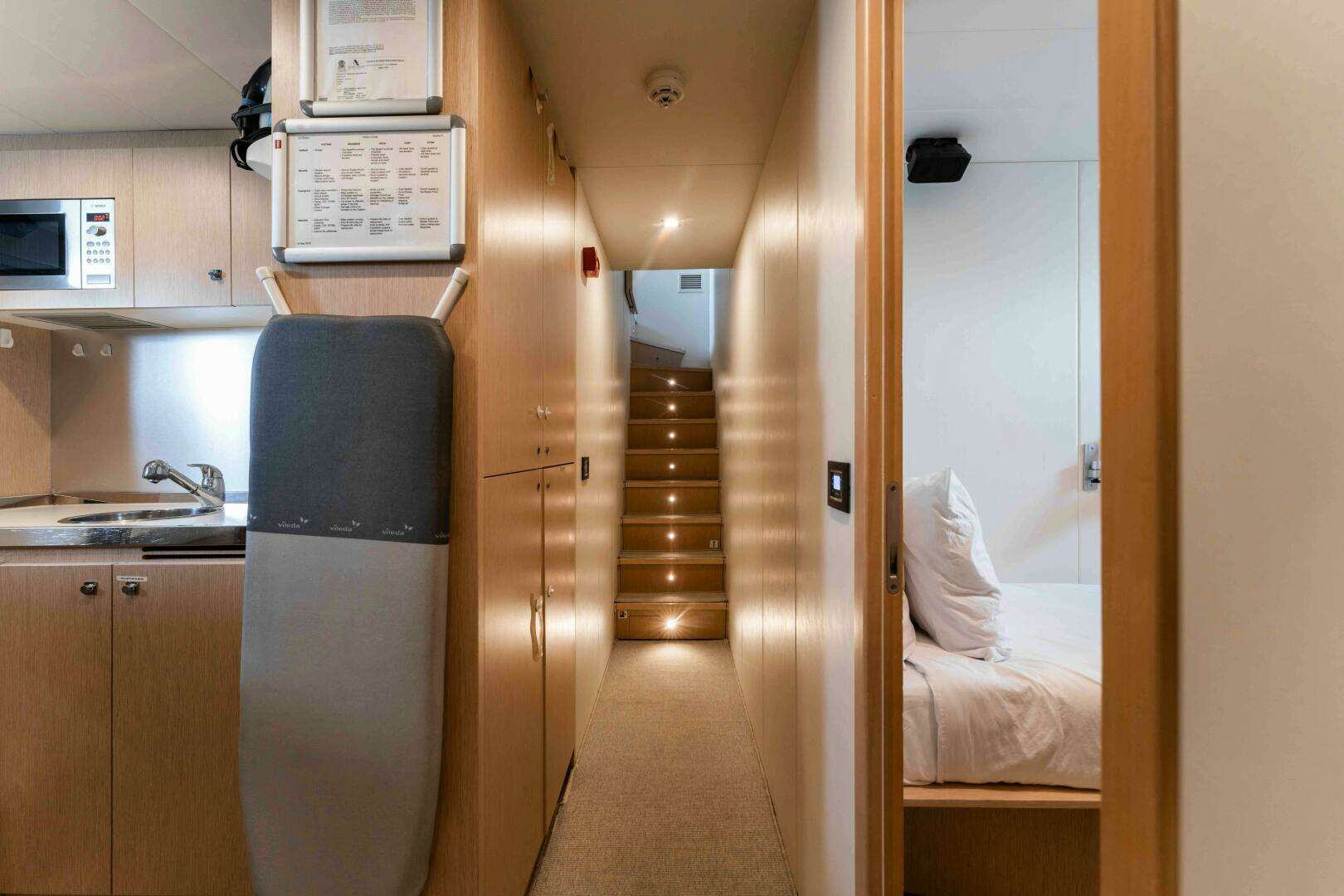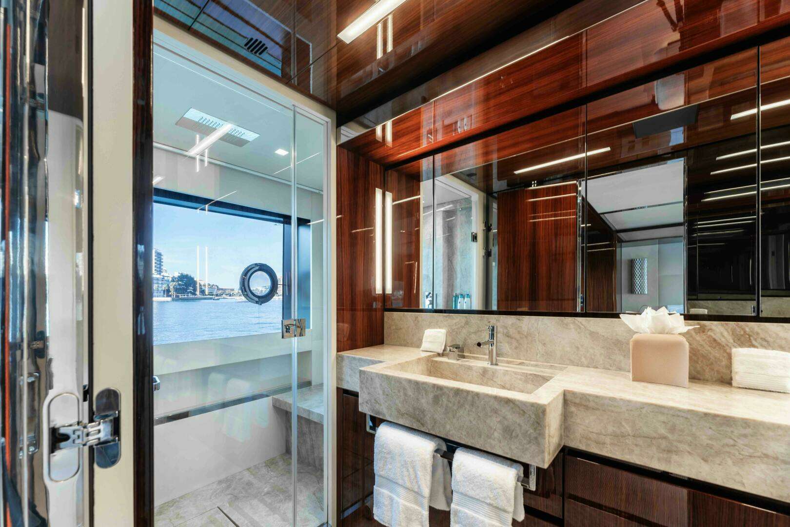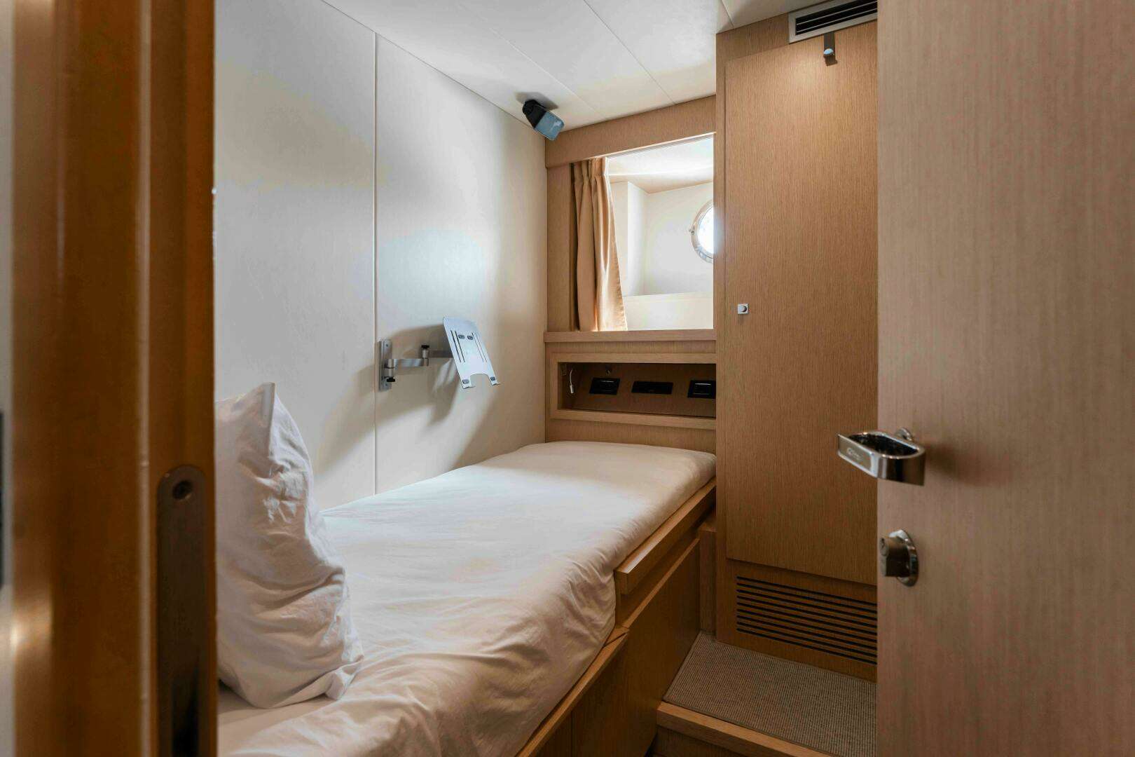 Accommodation is arranged for up to 11 guests across five cabins. The full-beam owner’s suite is located forward on the main deck and finished in striped tropical rosewood veneer, contrasting elegantly with white lacquer surfaces. Large windows, generous headroom, ample storage and a private en-suite create a calm and luxurious owner’s retreat. Four guest cabins are located on the lower deck, all comparable size and accessed from a central lobby. One cabin features sliding berths and an additional Pullman, providing flexibility for families or charter groups. Crew accommodation is arranged for five across three en-suite cabins, accessed discreetly via the galley.