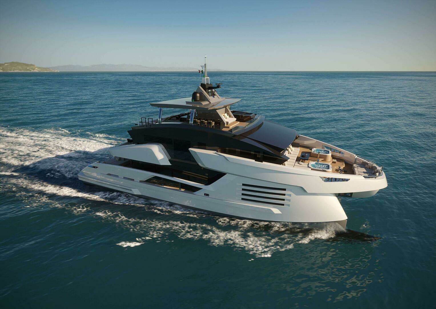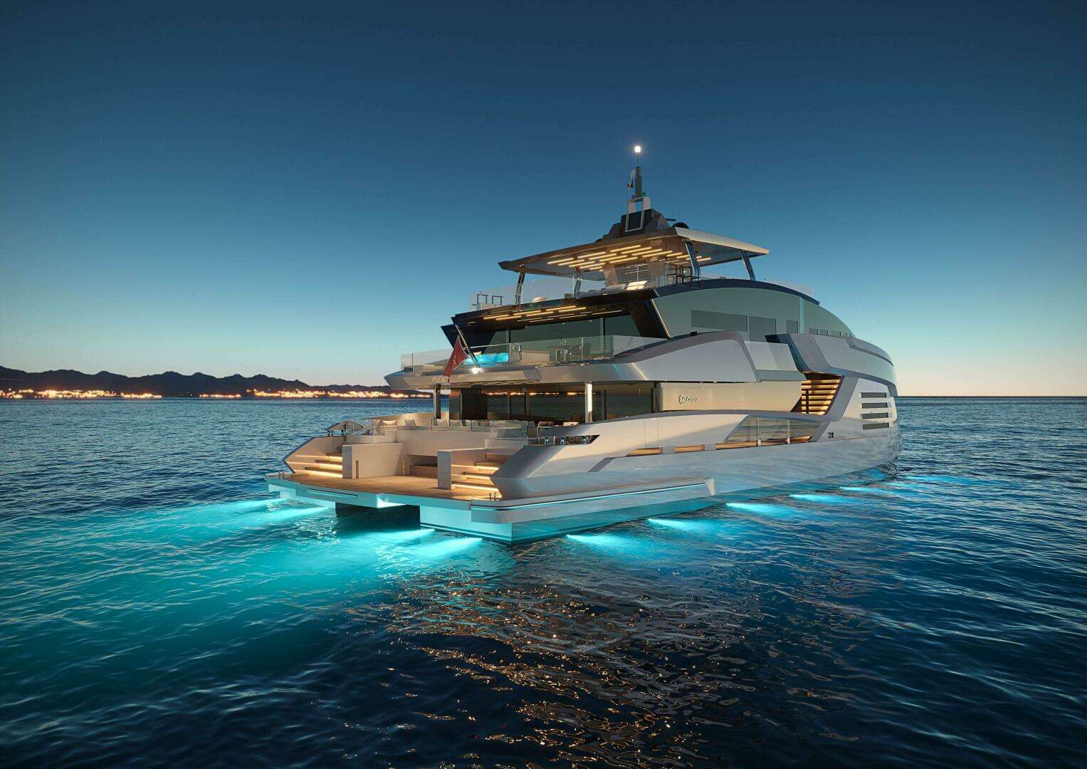 Enter into a new concept of space, light, volume, efficiency, sea-keeping ability and style! The CAT 110 offers unrivalled space and style, giving the interior space of a 50-metre yacht but 40% more (shaded) exterior space – all in a platform that is easy to find marina space. Her unrestricted navig