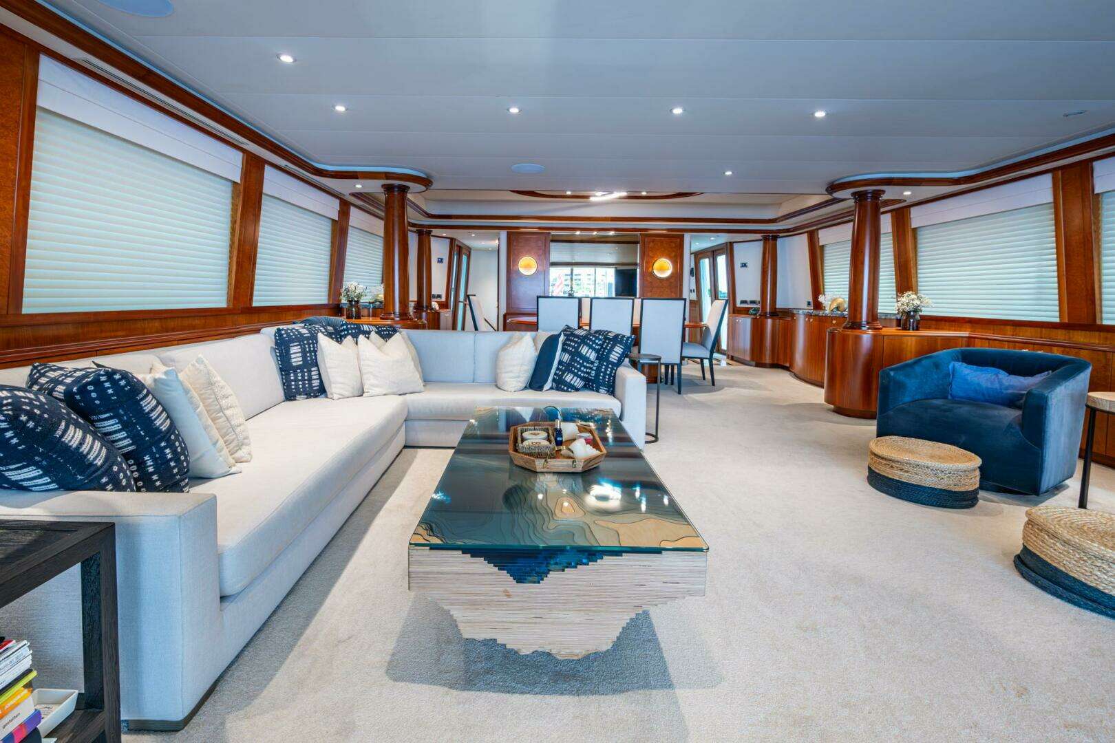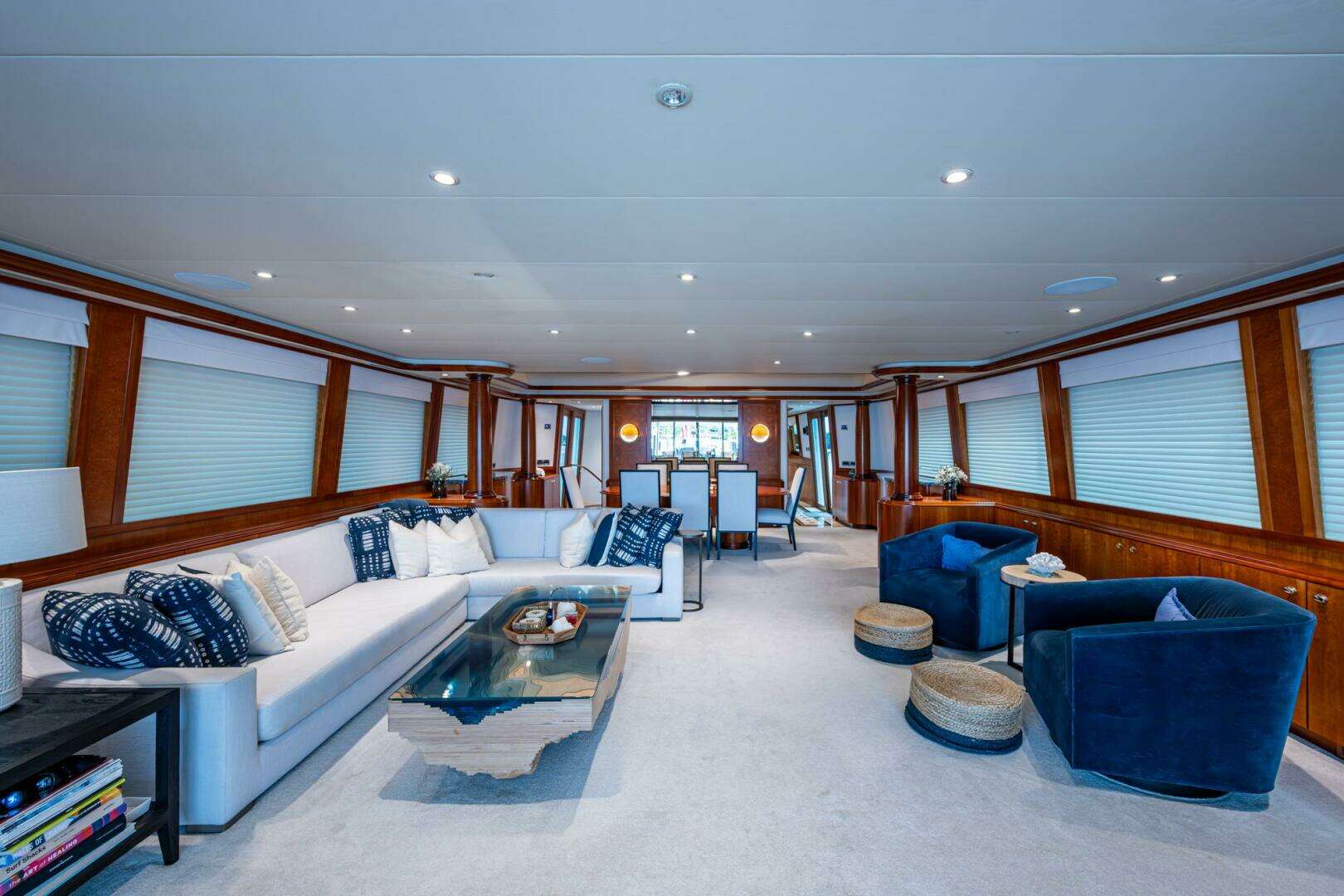 Her interior was transformed in 2019 by Chanel Coontz of Neosage, replacing dated tones with a serene indigo palette, elegant Azul stone surfaces, and sea-inspired details—creating a calm, sophisticated atmosphere. Further updates in 2021 added new teak on the swim platform, refreshed galley flooring, and updated crew spaces.