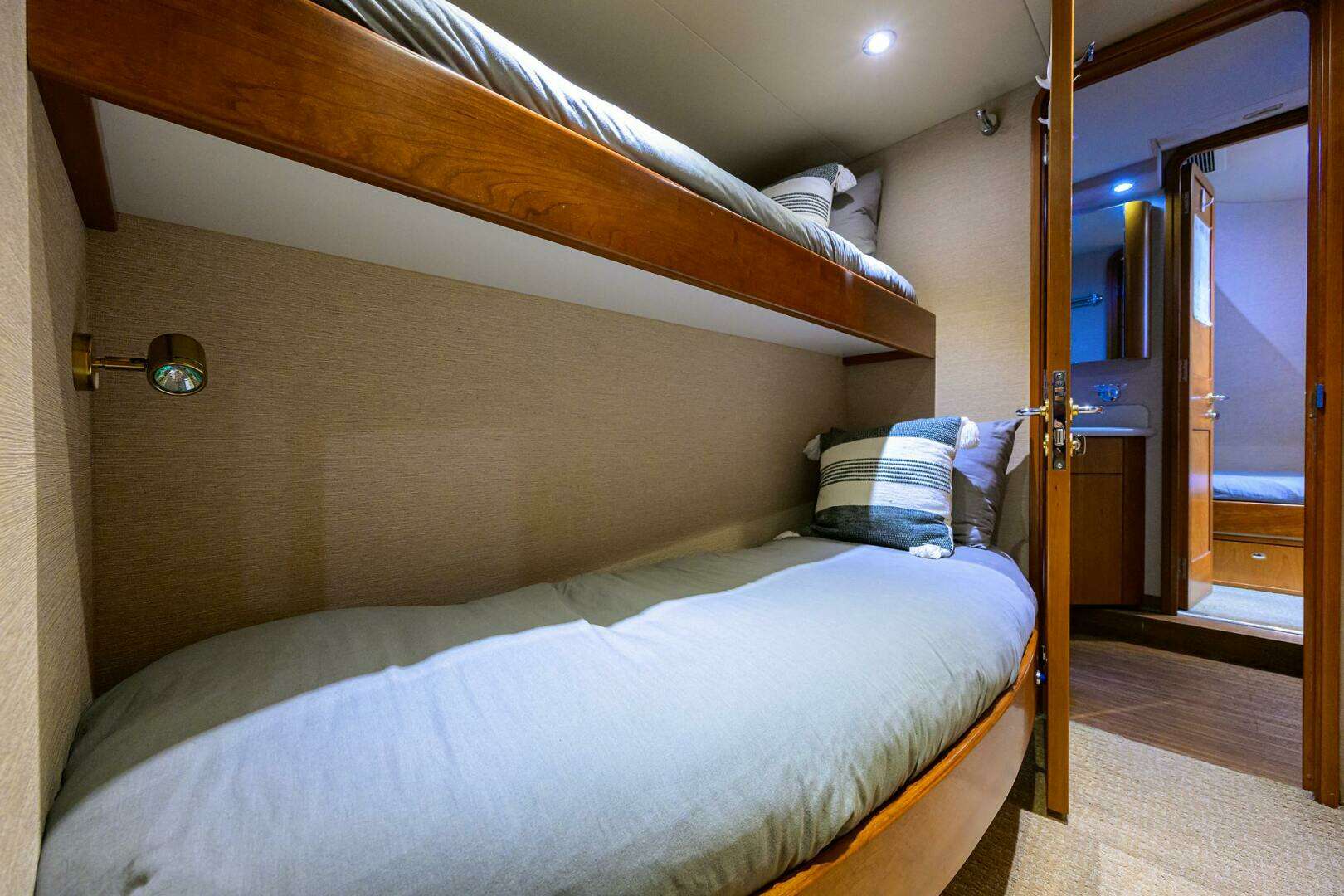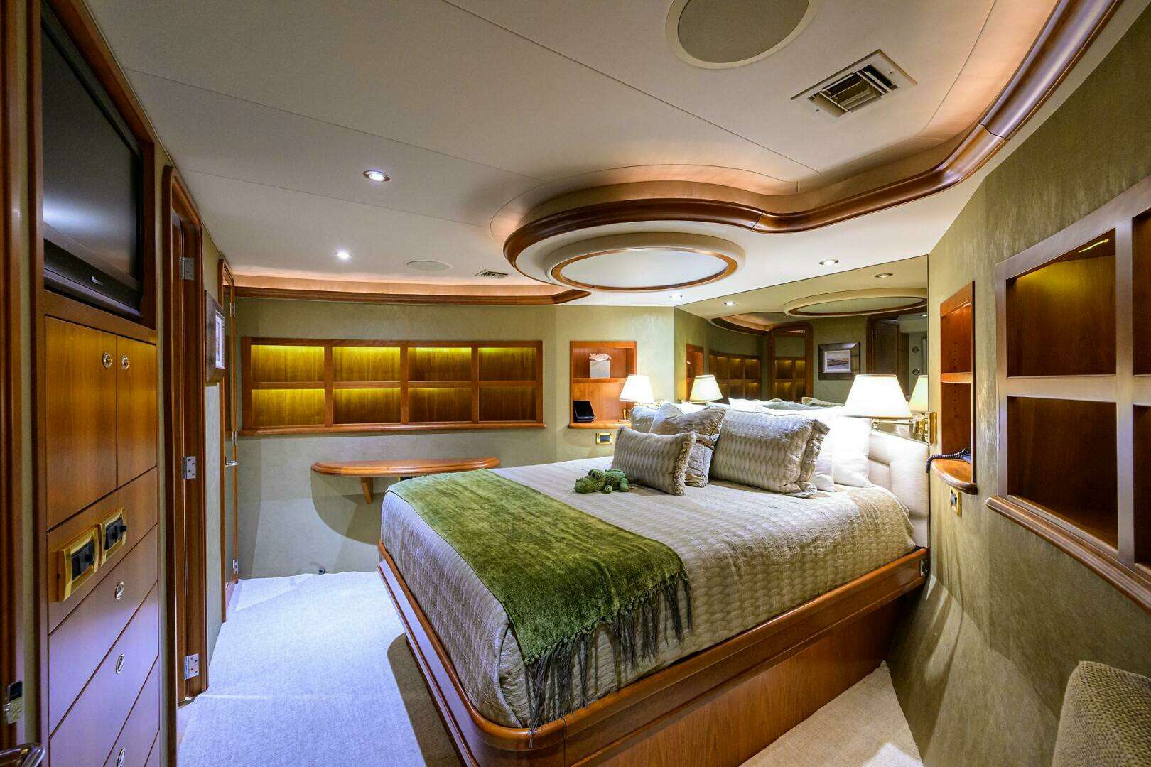 EXODUS can comfortably accommodate up to eight guests in four staterooms, with the master suite featuring a California King berth, upholstered headboard, a 15-drawer dresser, a walk-in wardrobe, opening port lights with screens and privacy covers and a TV with surround sound. The VIP cabin offers a queen berth, a walk-in cedar-lined wardrobe, a custom upholstered settee and a flat-screen TV. The portside guest stateroom features a queen berth, a cedar-lined wardrobe, opening port lights, an entertainment center with cherry doors and a flat-screen TV. The starboard side guest stateroom mirrors these amenities, and each cabin is complemented by an en-suite bathroom.