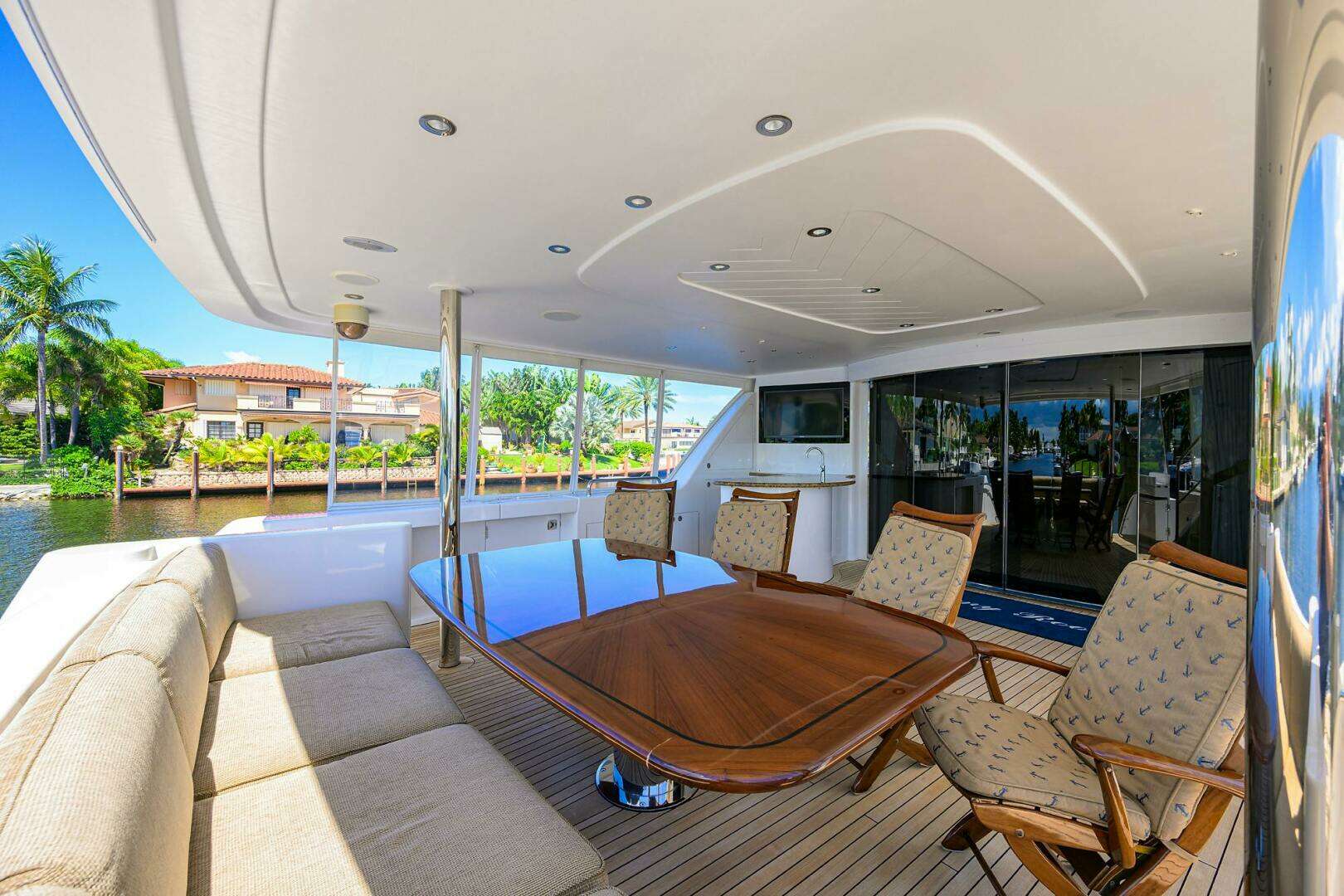 - Custom sun awning over flybridge lounge and jacuzzi (may be used underway)