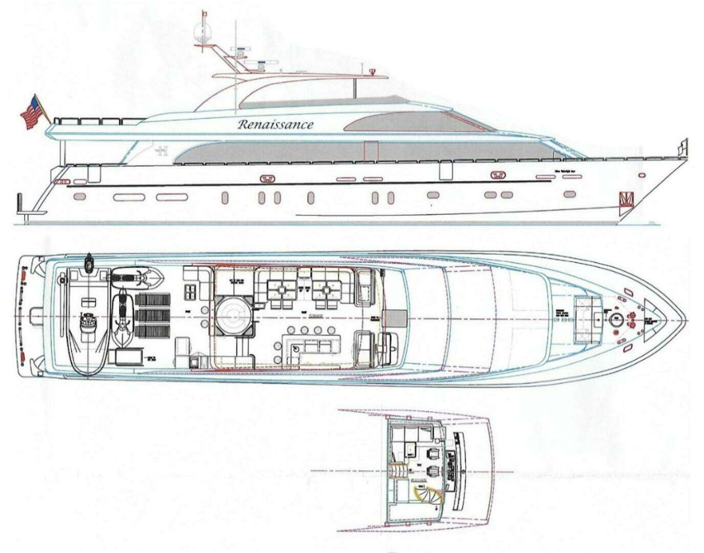 Built with a proven Jack Sarin performance hull design, fiberglass hull and superstructure, and teak decks, RENAISSANCE delivers both performance and comfort. Twin Caterpillar C32 Acert engines (1,900 HP each) provide an economical 14-knot cruise and a 20-knot top speed. Zero-speed (at-rest) and underway stabilizers ensure outstanding comfort. With a shallow draft of approximately 6 feet, she is ideally suited for Bahamas cruising.