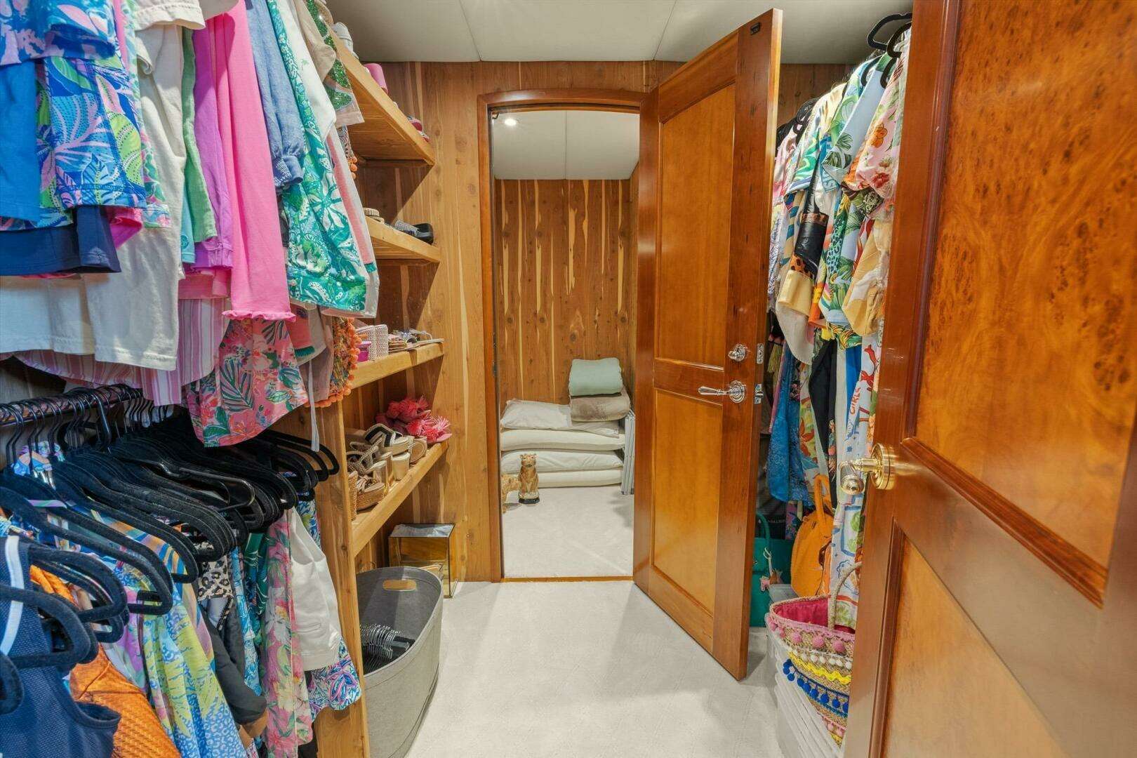 Accessed from the starboard foyer with impressive headroom, DIRT POOR’s guest accommodations are on the lower deck and comprise four spacious, ensuite staterooms. Aft, the full-beam master suite is a private retreat with a king-size bed, oversized walk-in closet, sofa, abundant drawer storage, and a luxurious his-and-hers bath with separate toilets, a spa-style Jacuzzi tub, and a generous shower. Large portholes bring in natural light for a calm, relaxing atmosphere.