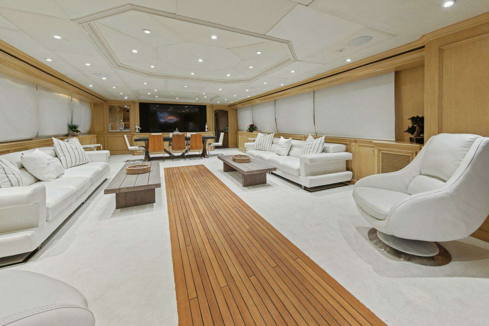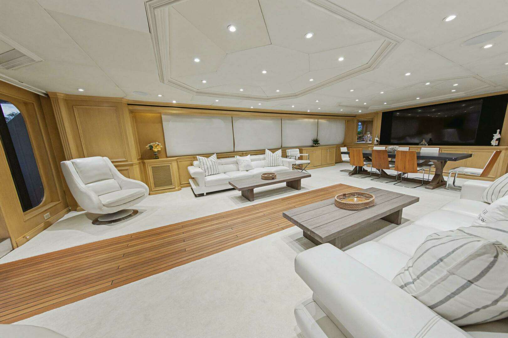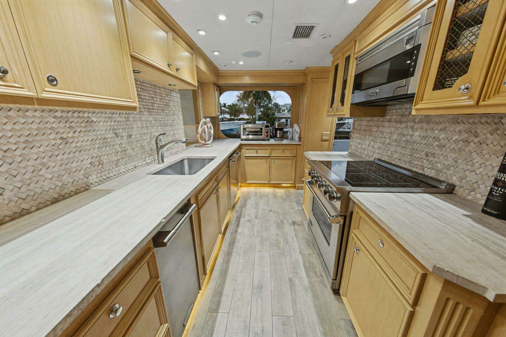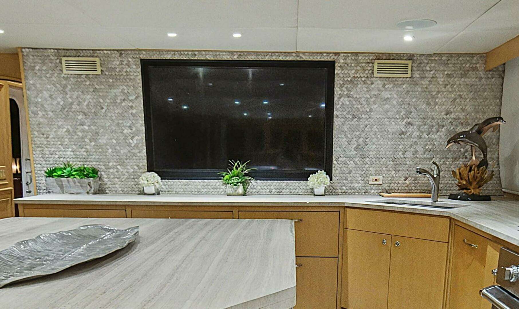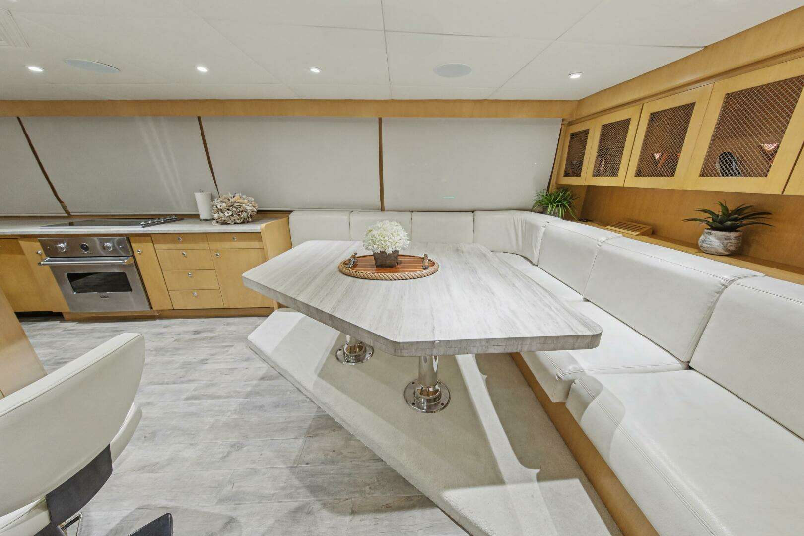 The main salon was redesigned to create a more open, inviting living space, and the layout was reconfigured to incorporate a spacious country kitchen on the main deck, featuring additional cooking equipment, a central island, and a large L-shaped dinette. The original galley remains in place as a serving galley while maintaining full functionality.