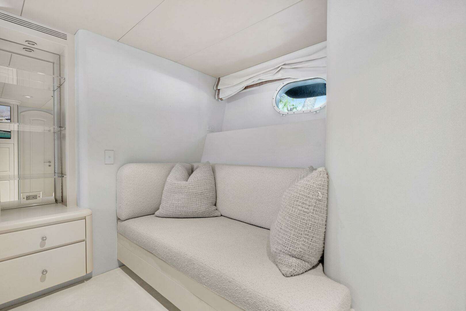 • Built-in cabinetry on forward bulkhead with custom lofted storage for wine and glasses