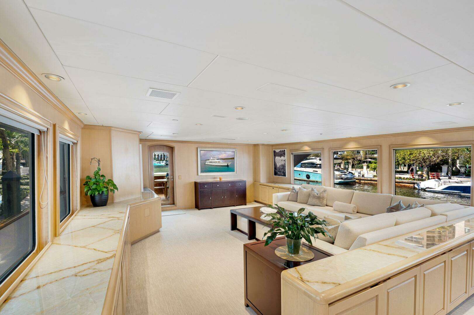 The Main Salon has a comfortably elegant feeling thanks to large windows, light wood and beautiful furnishings. Open sightlines to the dining area create an even larger feel.