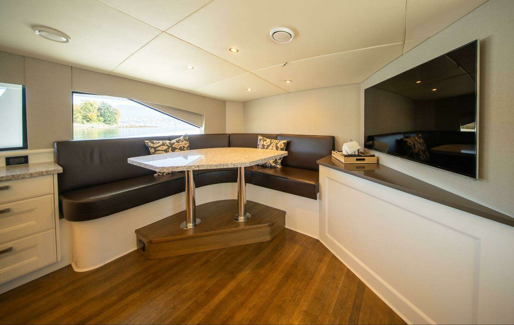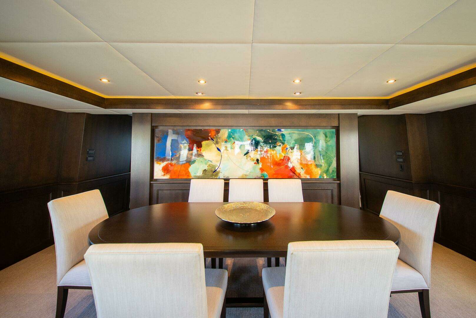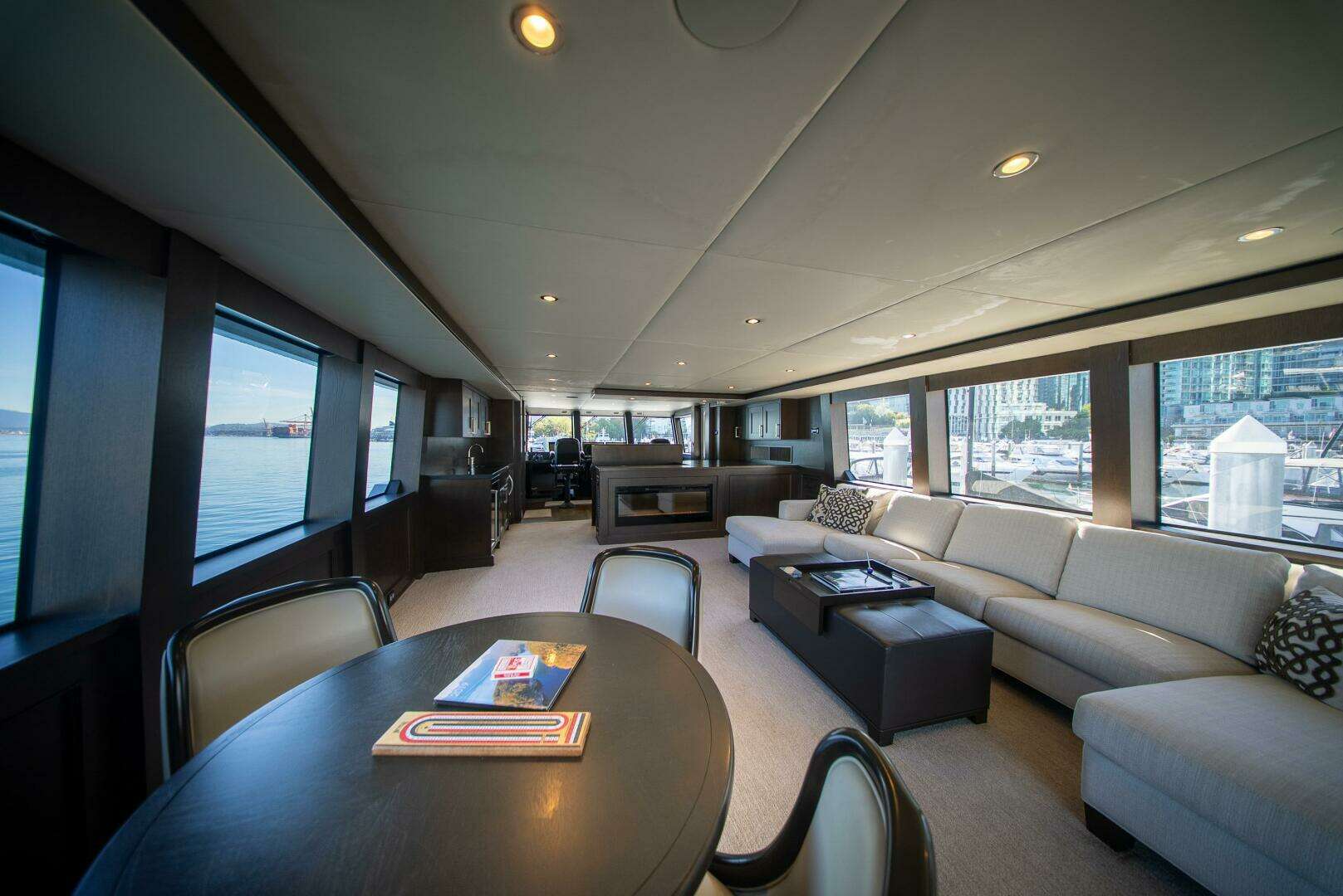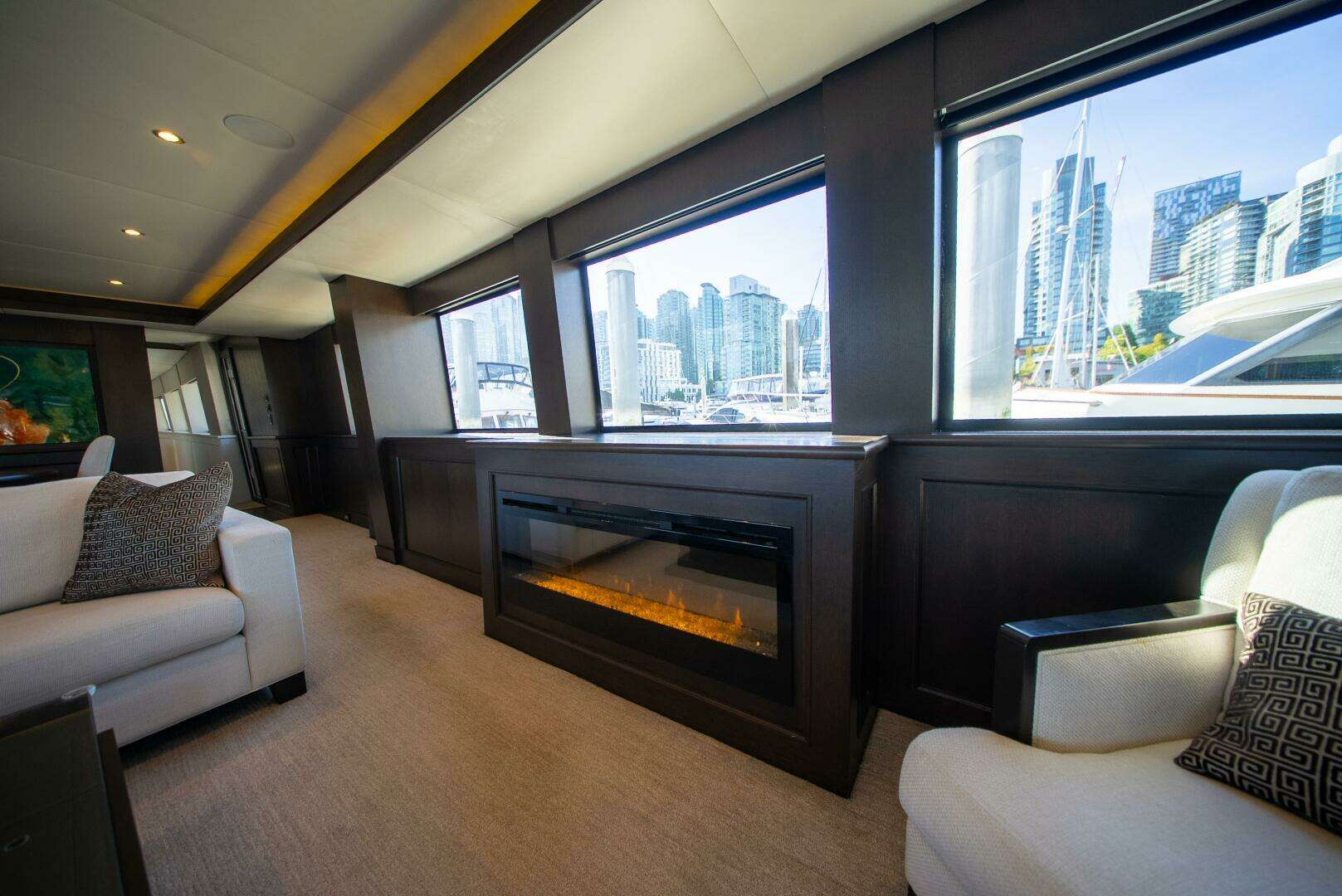 SALON - The salon is extremely spacious, taking advantage of the vessel's generous beam. The salon is designed with a formal dining area in the forward section, and a comfortable lounge area aft. It features an entertainment center and electric fire place. These two distinct areas of the salon are beautifully highlighted by soft lighting and and large windows that enhance your views. All windows equipped with electric window shades.