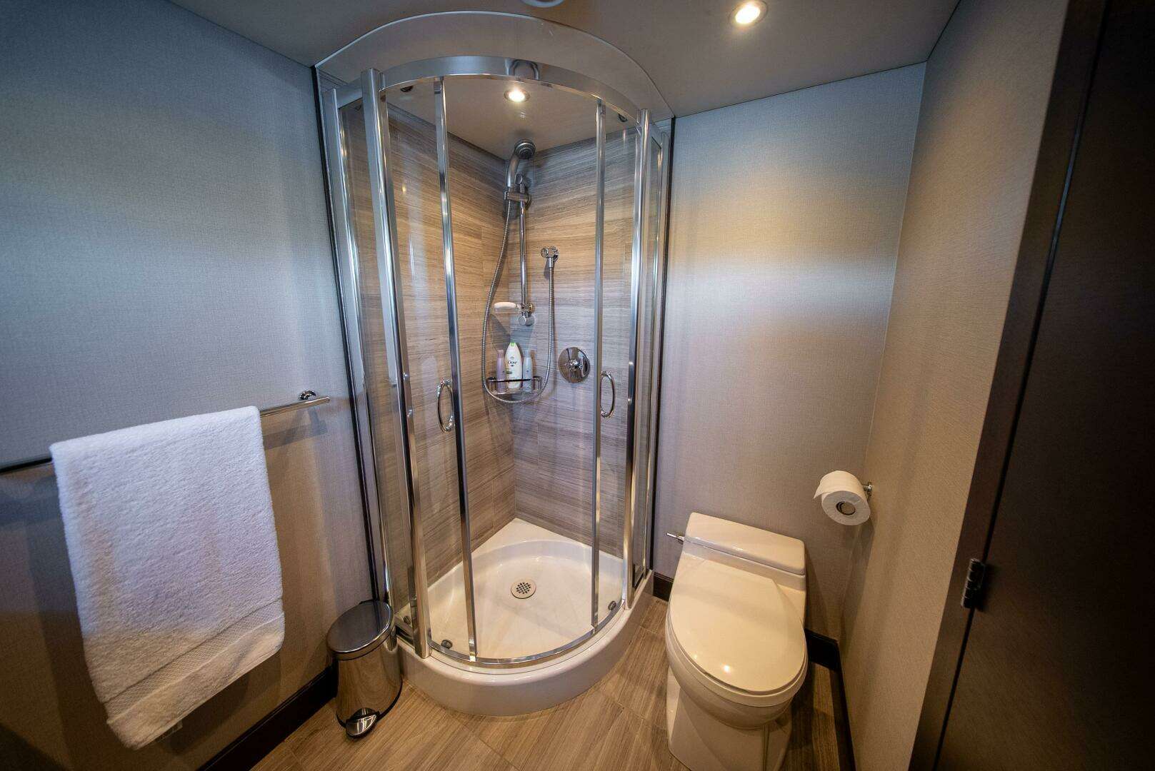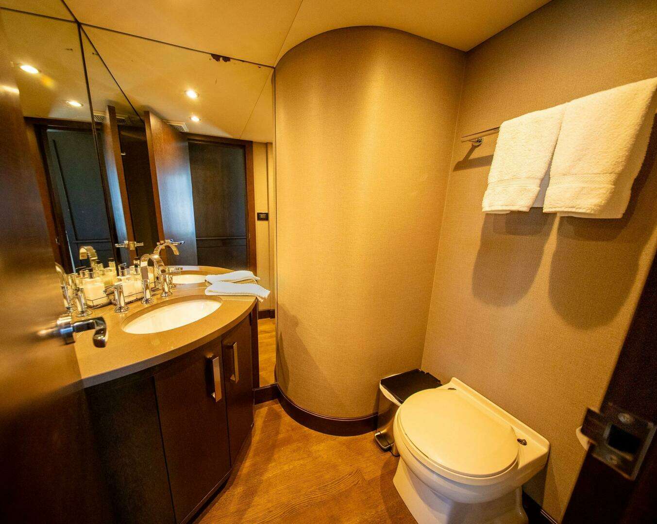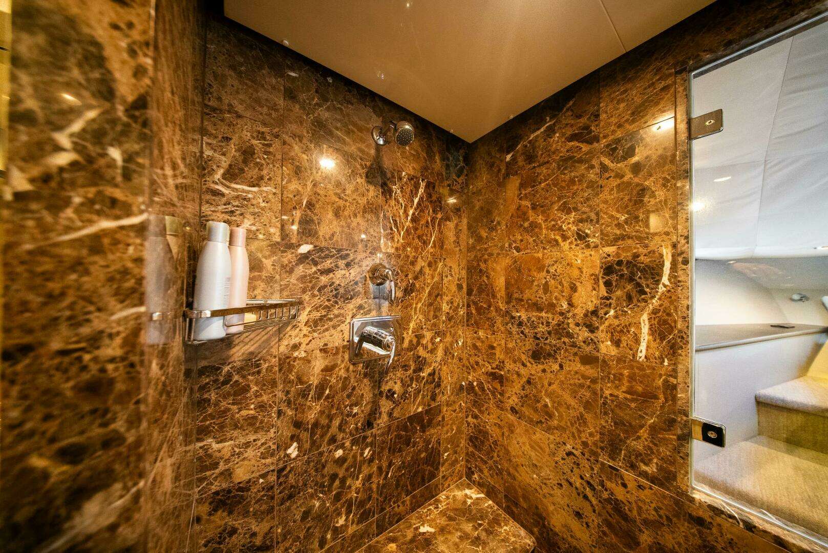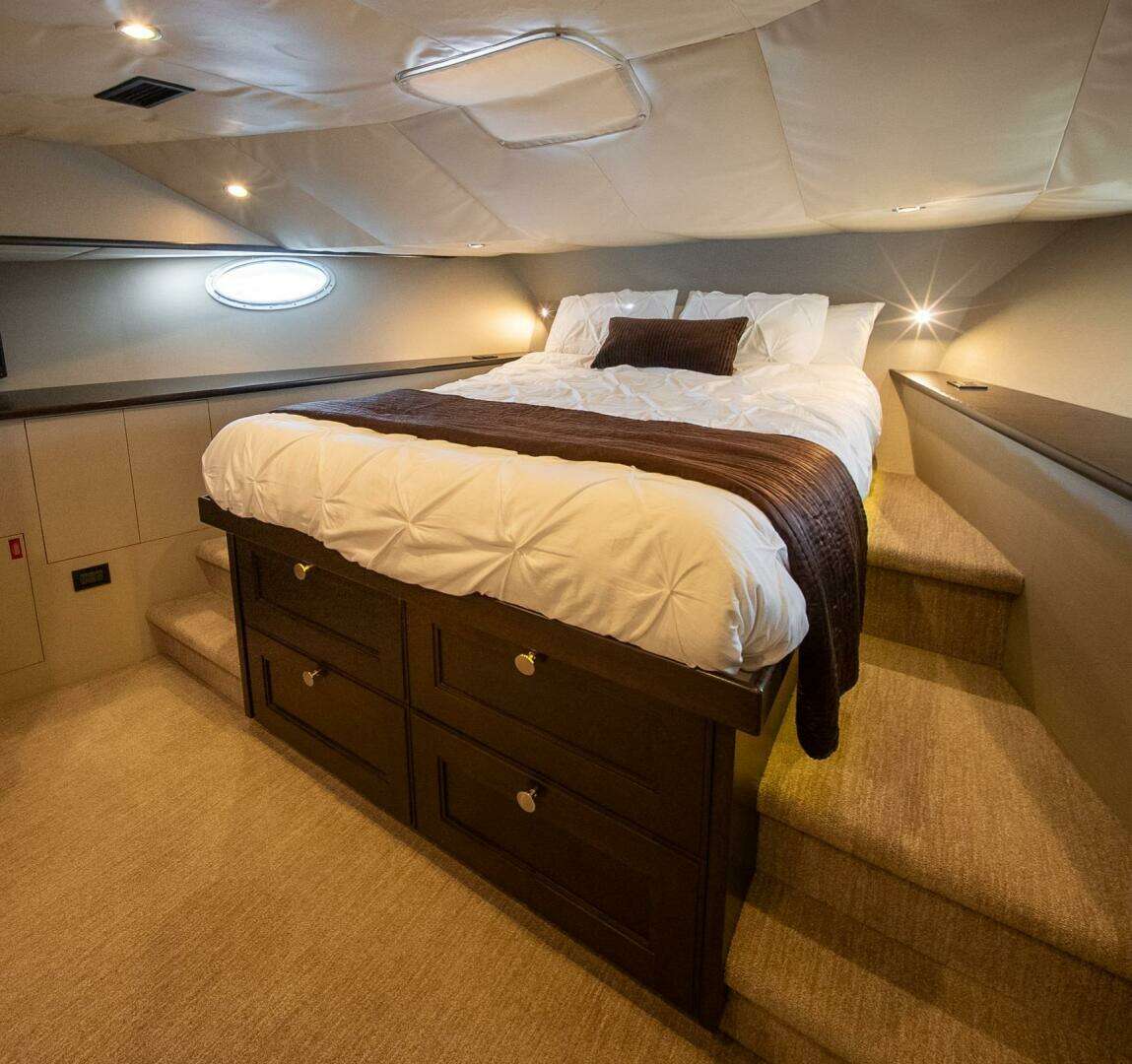 Forward of the galley you will find a private stairway to the VIP Suite. This stateroom includes an island bed with a in suite head that features a stunning glass paneled shower enclosure.