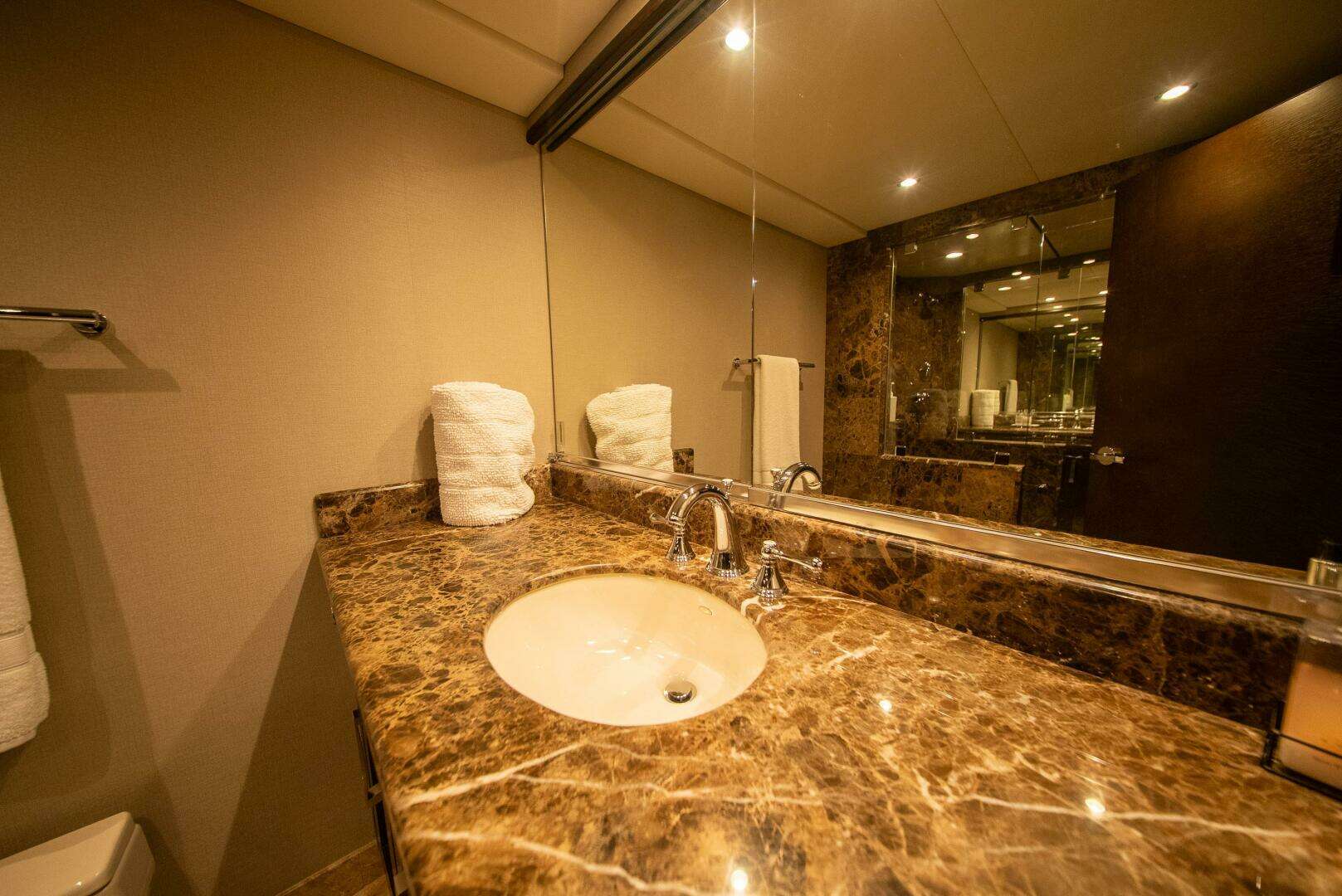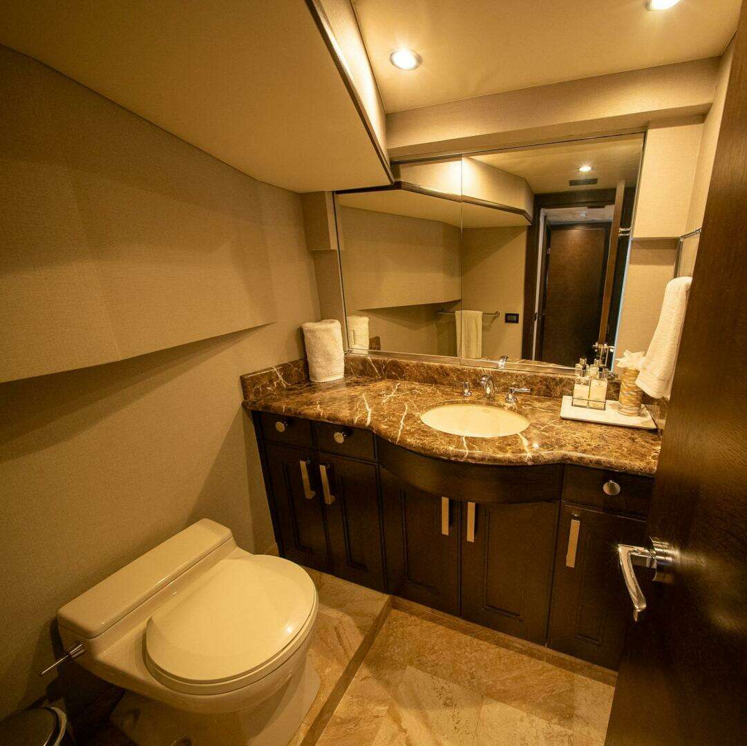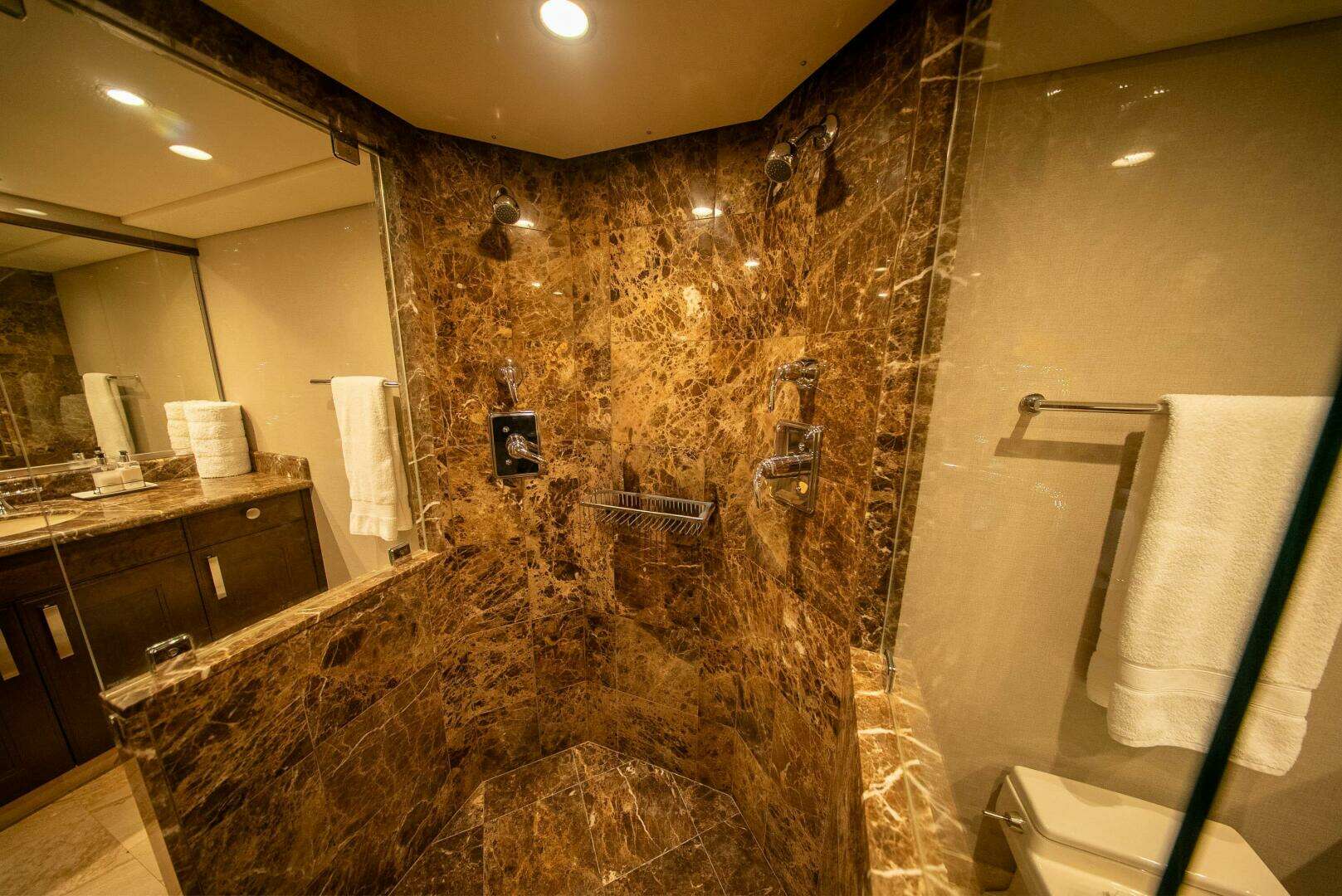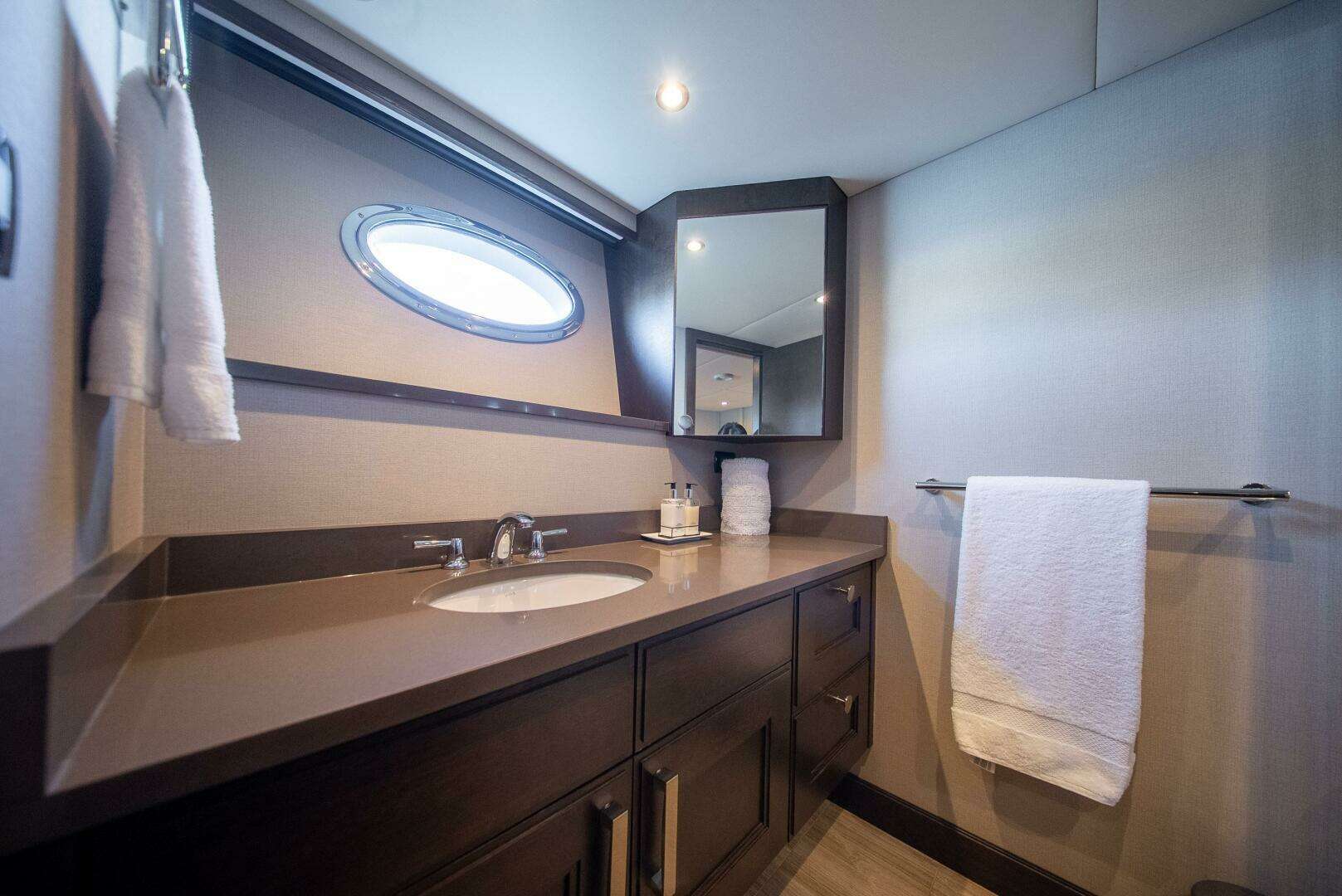 Forward of the galley you will find a private stairway to the VIP Suite. This stateroom includes an island bed with a in suite head that features a stunning glass paneled shower enclosure.
