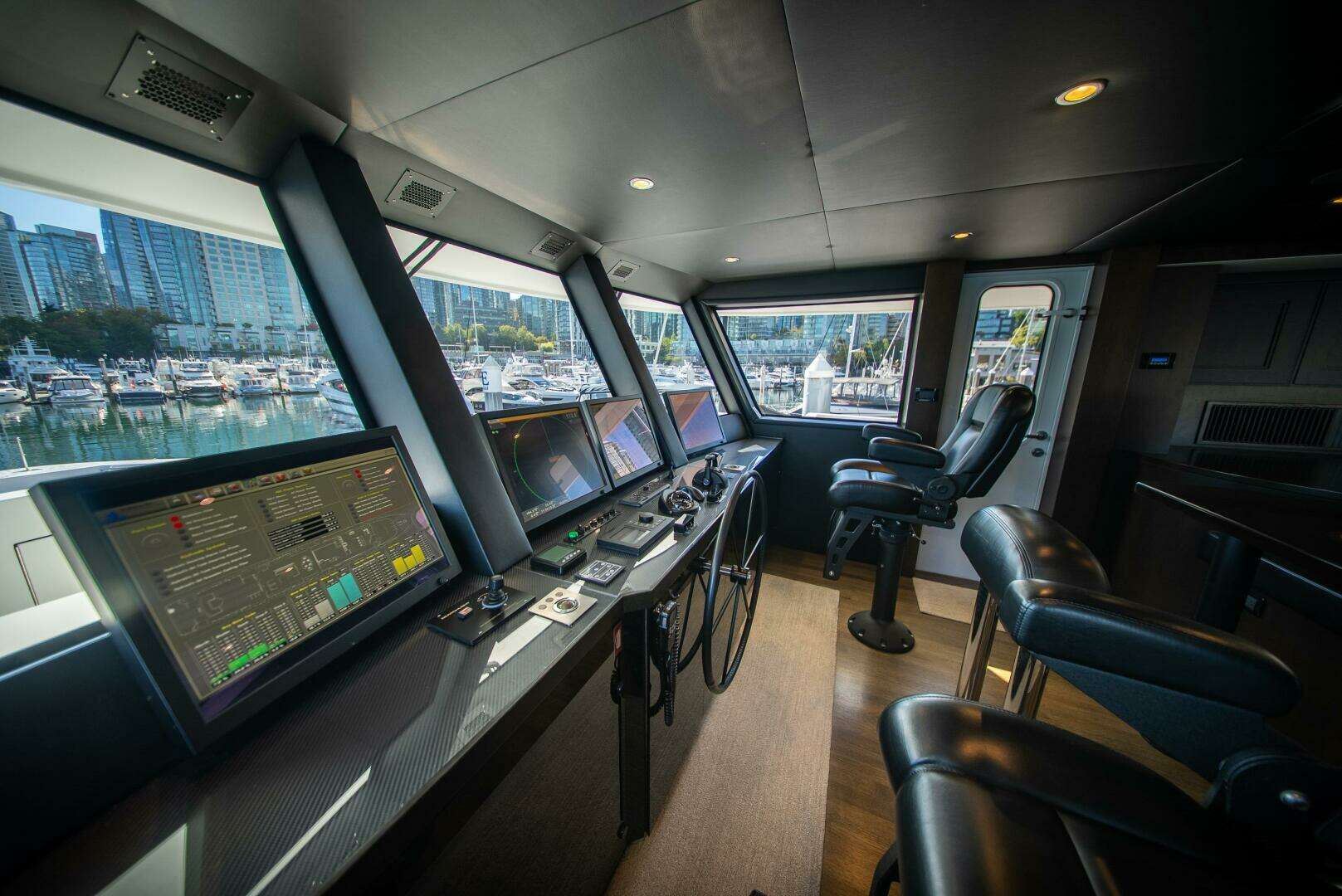 The business area of the ship...Encore's navigation systems have allowed her to safely travel to the most northern spots on British Columbia's coast as well as to Mexico, Florida and the Bahama's. Her reverse angle windshield not only provides a unique look, it also reduces night operations glare and sheds water quicker. In addition to her twin helm seats, there is also a comfy raised bench seat and "nav" table to let the armchair Admiral's assist with the decision making.