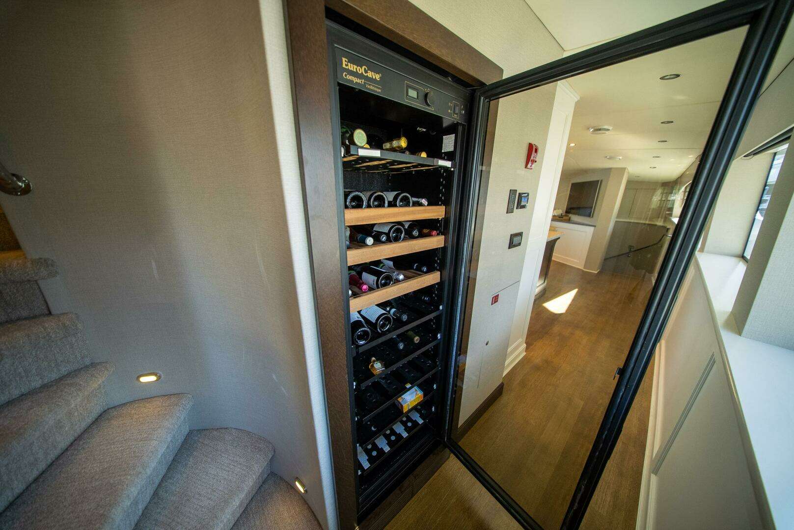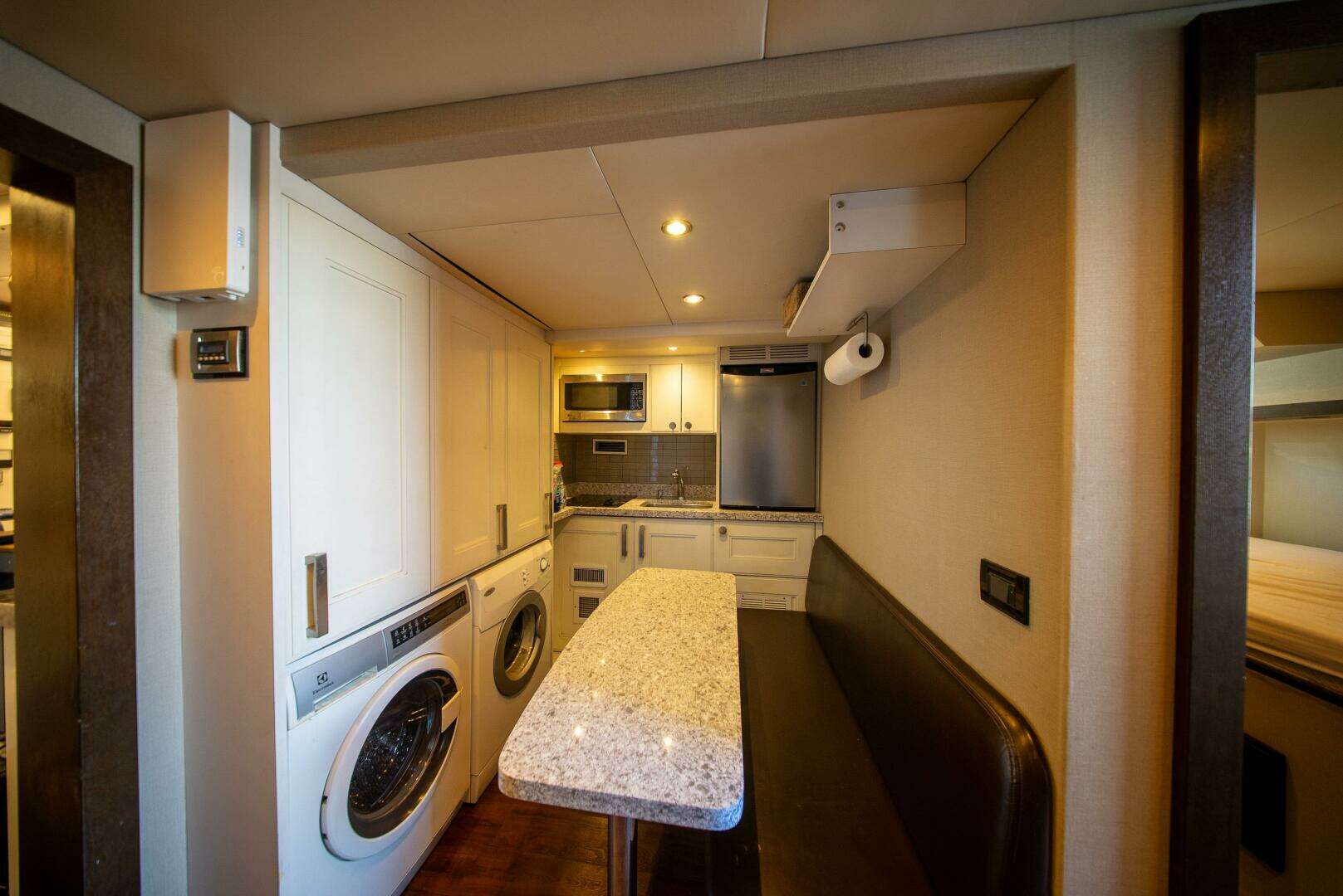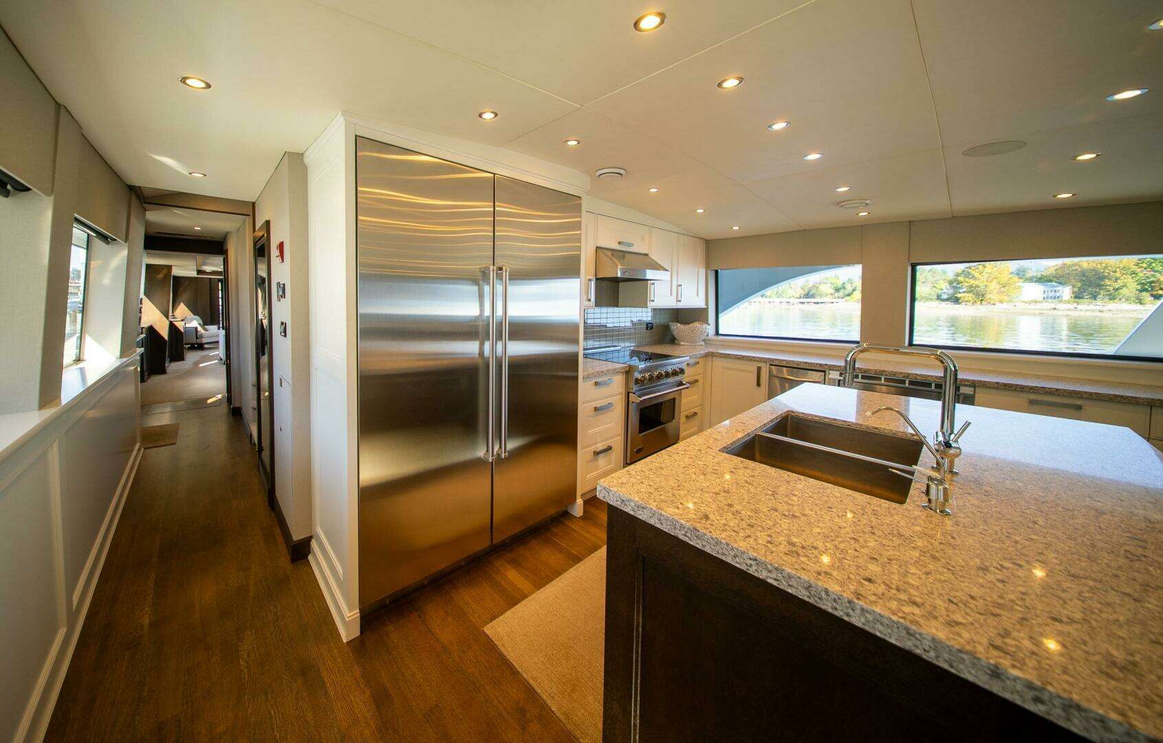 GALLEY - Accessed from the starboard companionway, immediately forward of the day head, or from the starboard main deck entry door. This allows the galley to have discreet entries and be entirely closed off from the remainder of the vessel and not disturb owner and guests. The galley is equipped with large Sub Zero refrigeration and has tremendous storage space to compliment her upgraded appliances and a large granite prep surfaces.