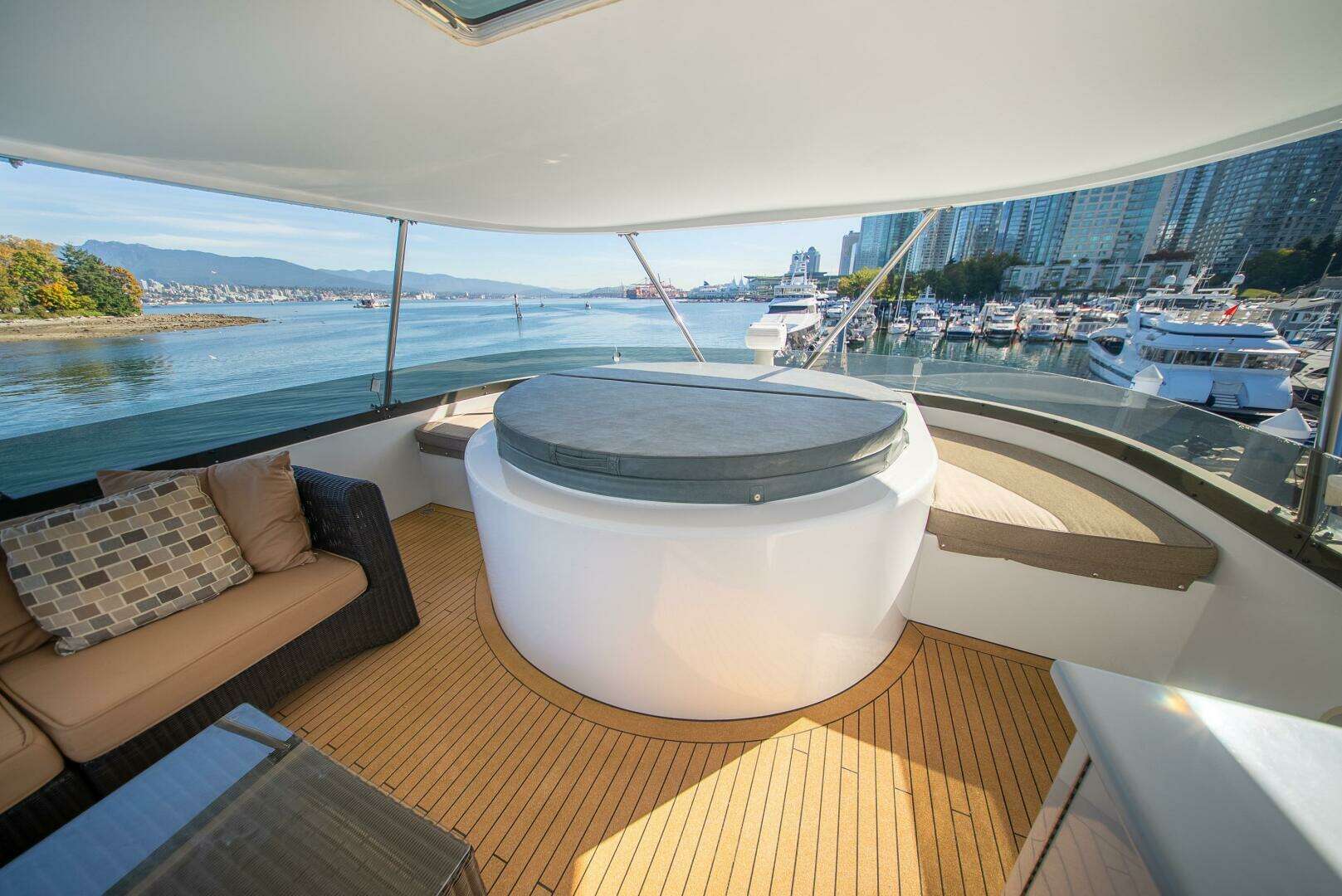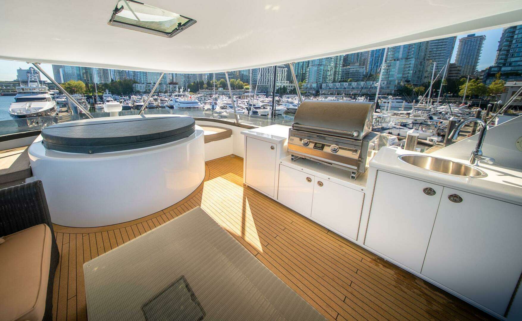 FLYBRIDGE - The place to lounge on a sunning day. The views are unobstructed, and comfortable seating is provided for everyone on board. The hot tub and built in BBQ grill make this the place to entertain.