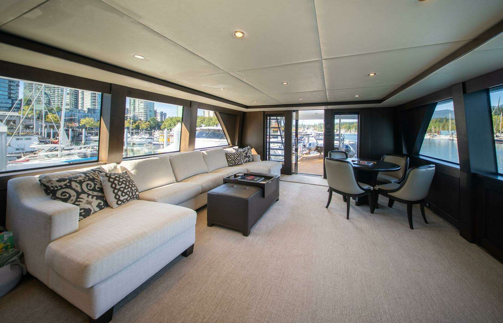 SKY LOUNGE - features a large sectional couch, a games table and the view forward encompasses the full wheelhouse. This lounging area is equipped a large TV, icemaker, beverage refrigerator and sink. An electric fireplace provides a warm glow adding ambience to any evening