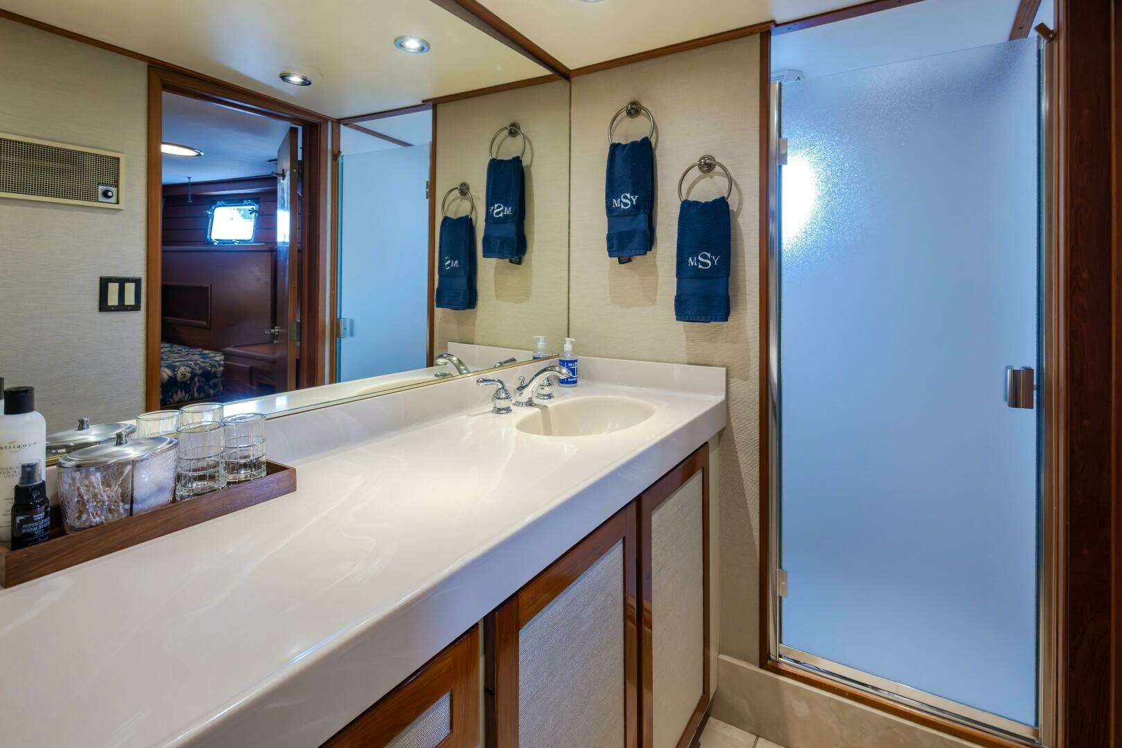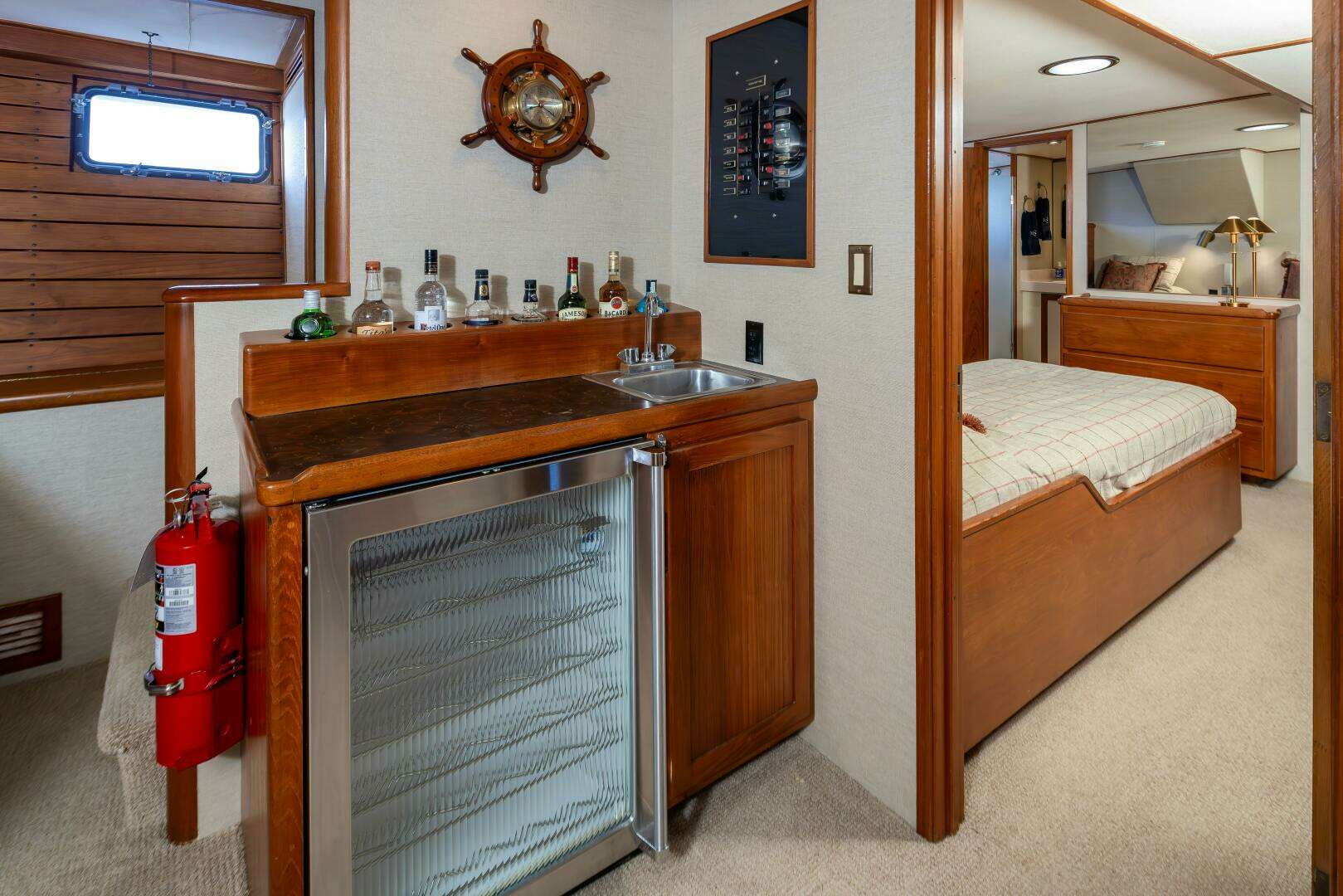 The fully enclosed pilothouse is outfitted with a complete suite of modern electronics and features dual helm chairs; the starboard chair is custom built by Eames Lounge chair along with two full settees and a tables positioned aft of the helm for comfortable navigation and guest seating. Port and starboard doors provide direct access to the full walk-around decks and boat deck, offering excellent flow and visibility while underway or docking. A dedicated Captain’s office is located aft within the pilothouse, beautifully finished with fresh wall coverings and rich teak accents, creating a refined and highly functional command space. The captain’s stateroom is adjacent to the office. - Koopnautic fin stabilization- Furuno FCV 1100 depth sounder