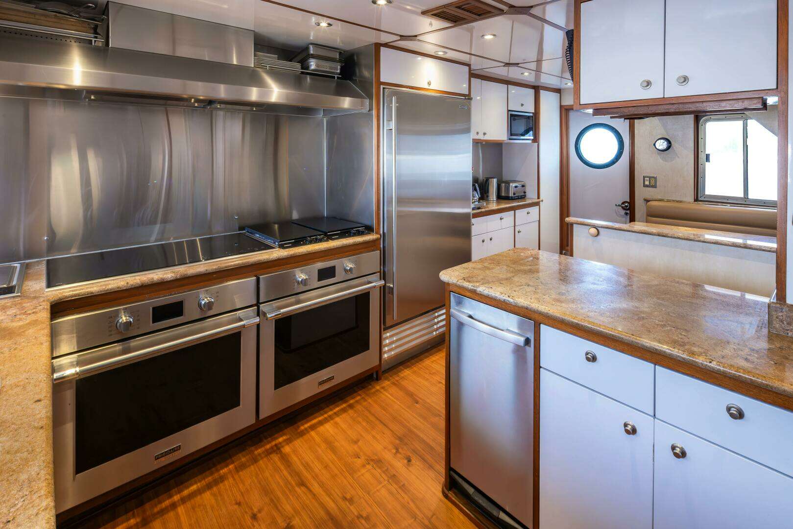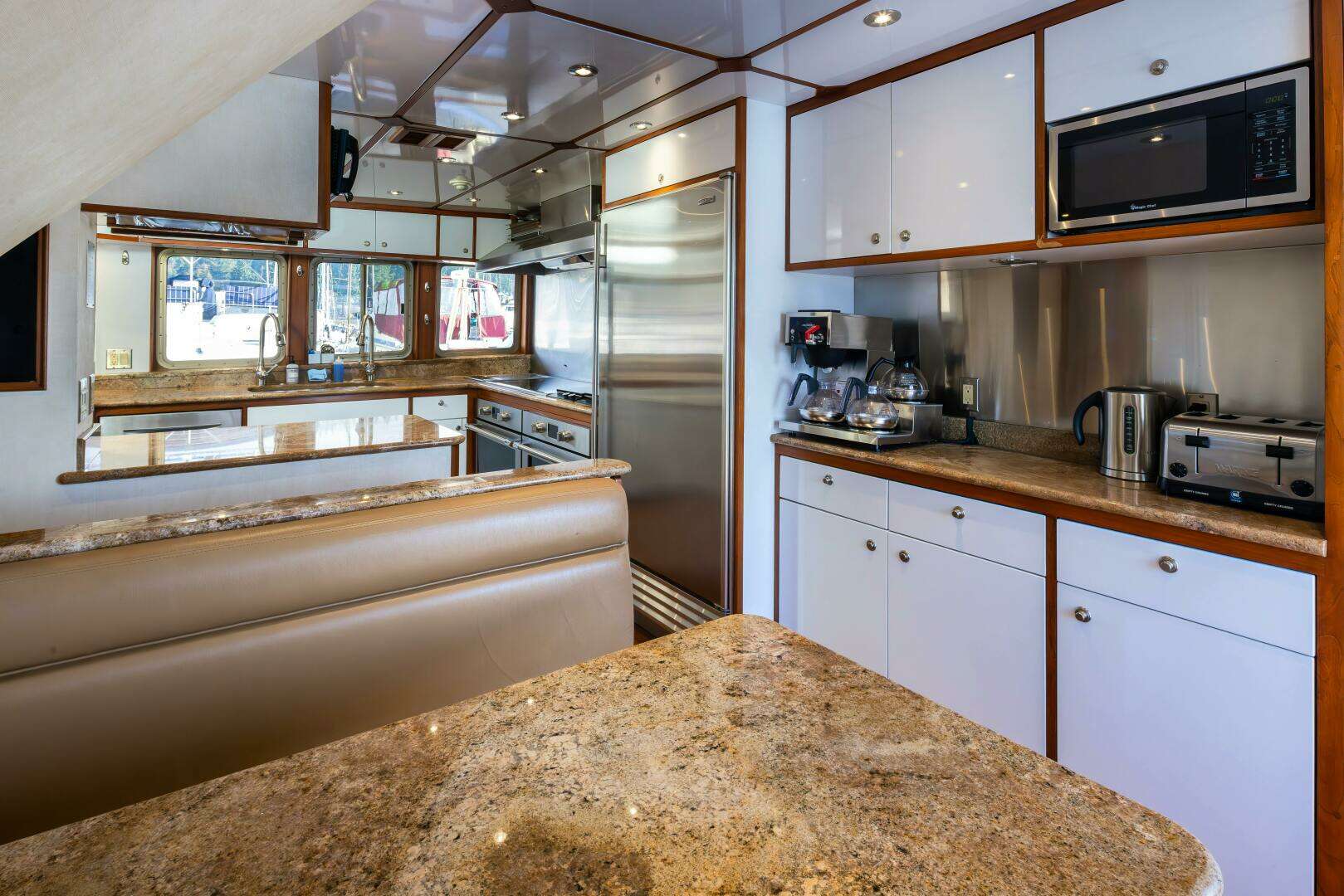 The completely remodeled galley features commercial-grade appliances and refrigeration, offering exceptional capability for extended cruising or entertaining. A large settee with seating for four provides a comfortable dinette area, while abundant custom cabinetry and storage make this galley perfectly suited for even the most discerning chef. -Remodeled with all new appliances-Sub-Zero full-size refrigerator