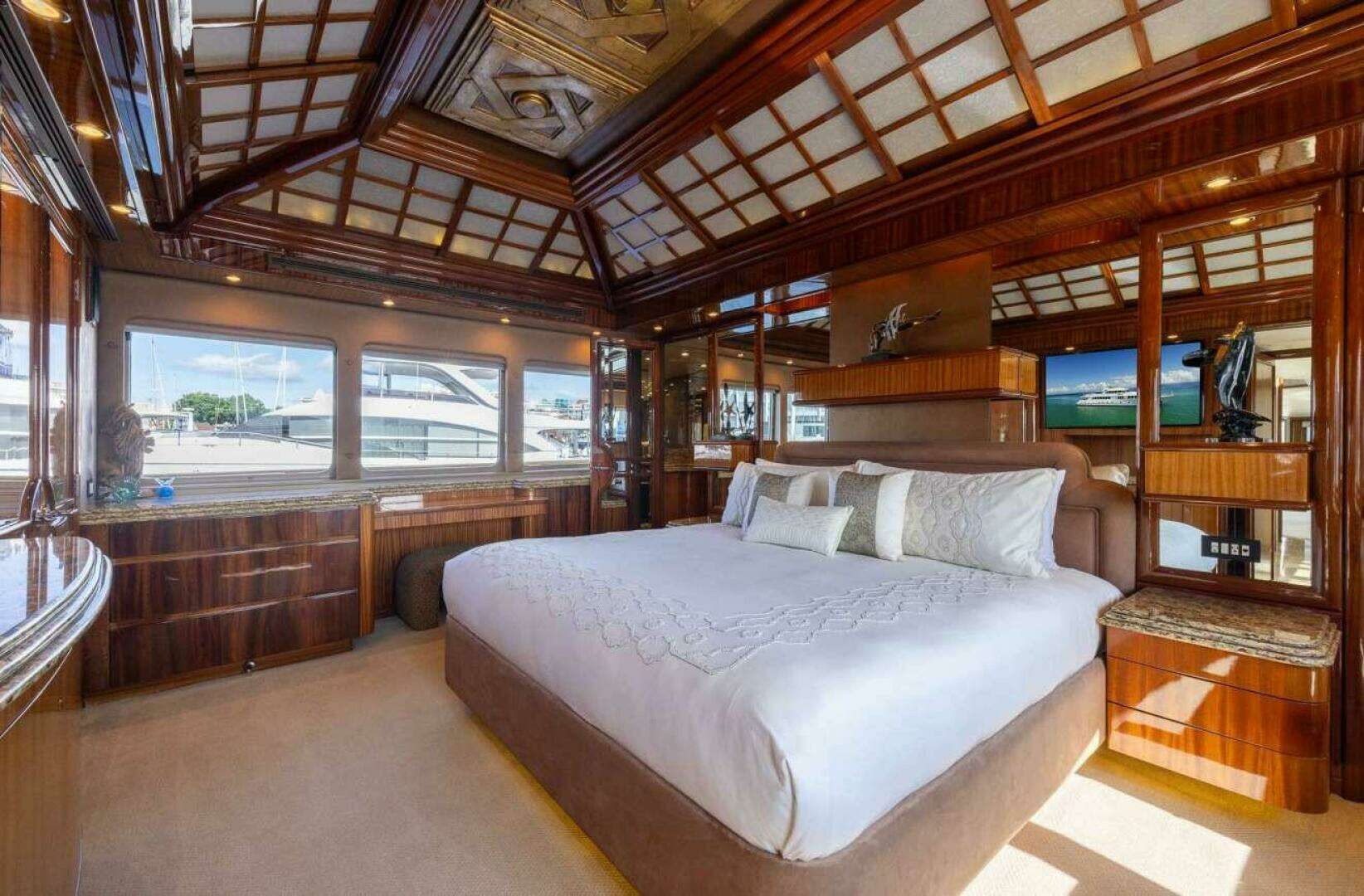Forward on the main deck is the full-beam master suite—a standout feature rarely found on yachts of this size and pedigree. This private retreat offers panoramic views, a king-size berth, ample wardrobe storage, and a beautifully appointed ensuite bathroom with marble finishes, including a spa-style wet-room with a step-down soaking tub inside a glass-enclosed rain shower.