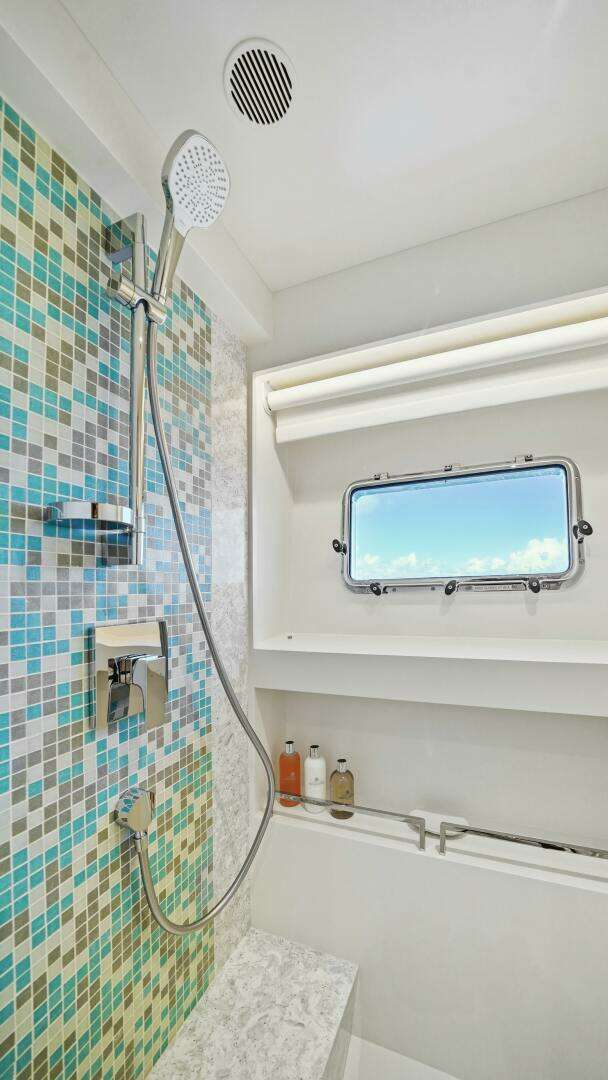Tucked behind the engine room—equipped with twin CAT C32B 2,400hp engines and twin Northern Lights 65kW generators—the beach club is a multi-functional escape. This space features a central coffee table, sofa bed, two moveable chairs, and a 43” Hi/Lo TV, and can also serve as an additional stateroom complete with a full head and overhead shower.