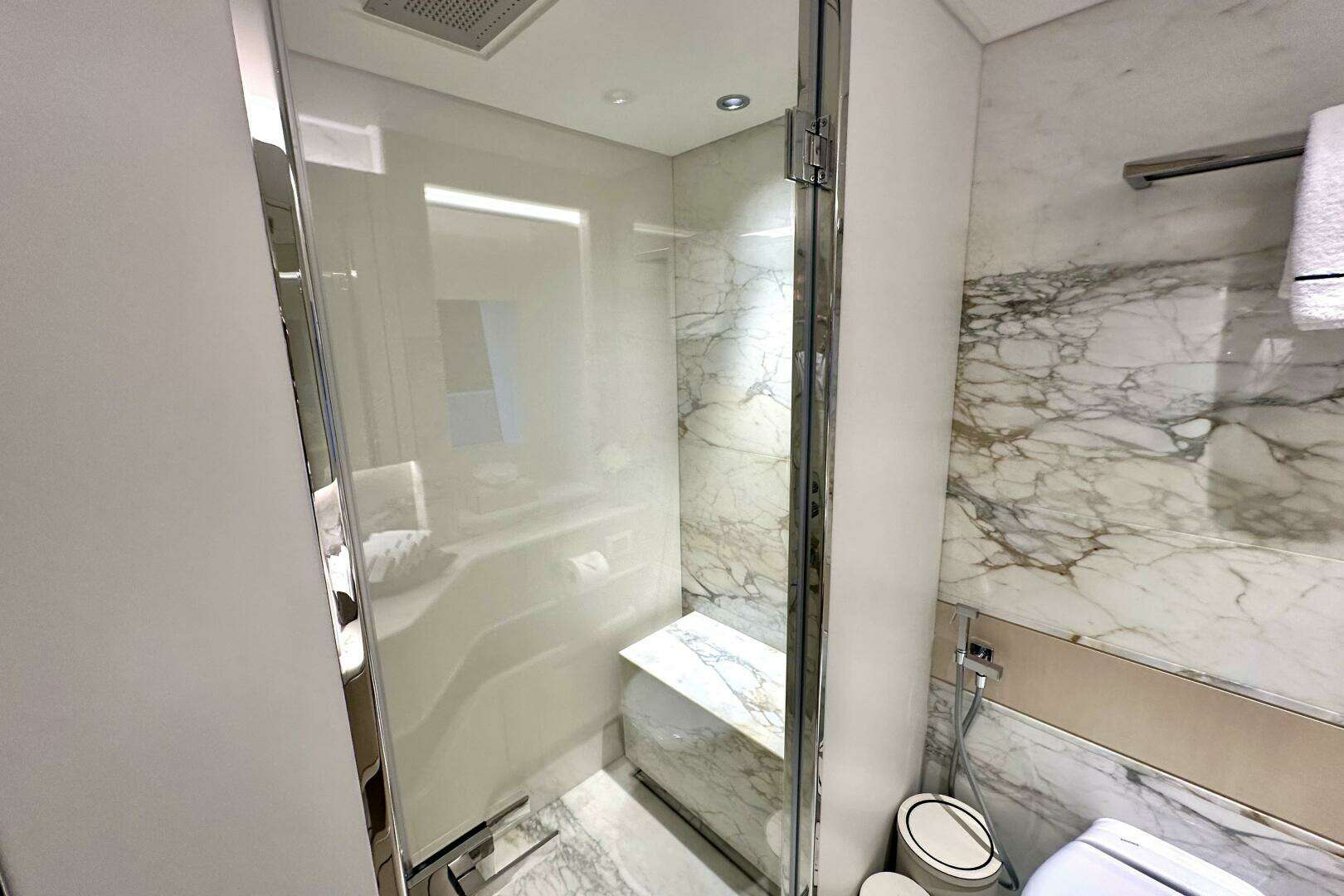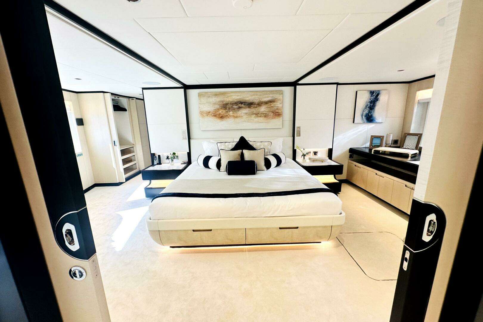 Owner’s Suite: Main deck forward, full-beam with walk-in closet, lounge area, and marble bath.