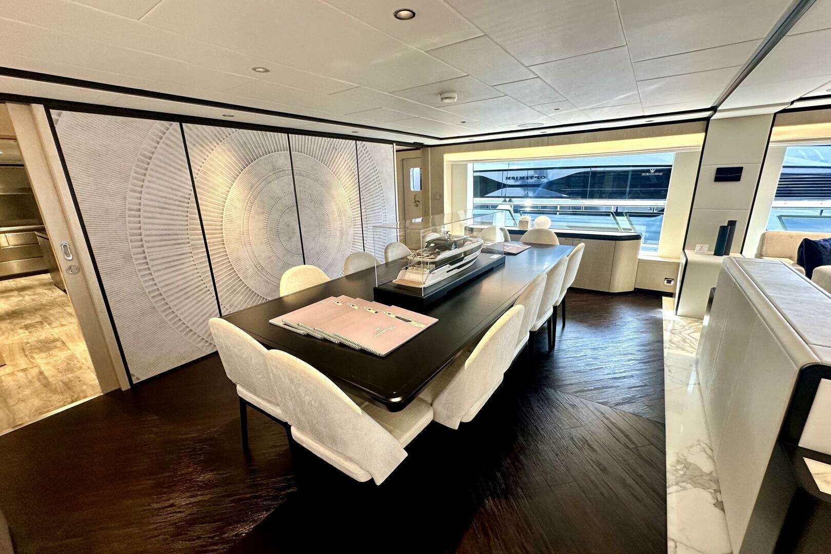 Main saloon with dual sofas, pop-up 55” 4K TV, and dining for 10