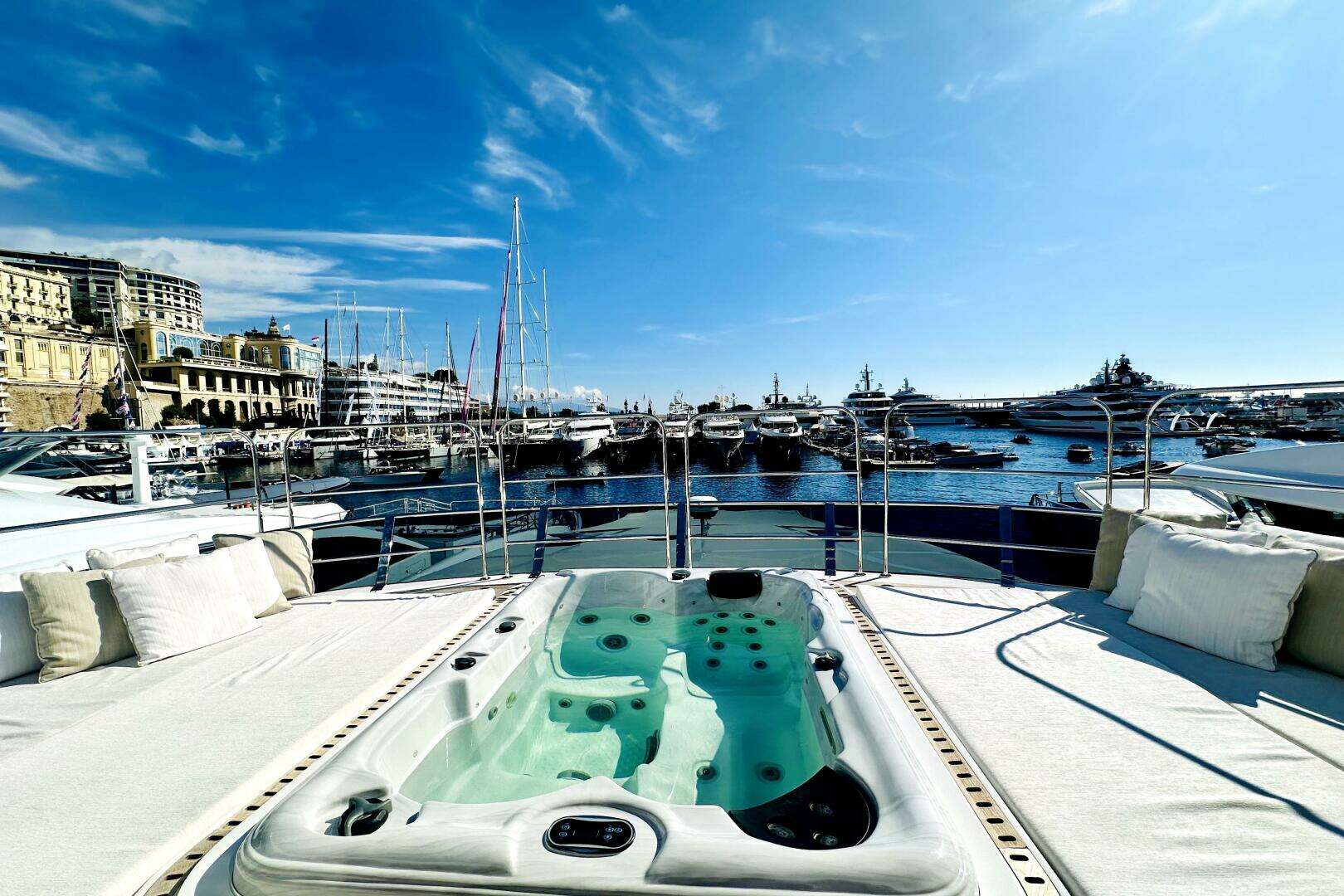 Expansive sundeck with Jacuzzi, wet bar, BBQ grill, ice maker, fridge, sun loungers & retractable hardtop access ladder