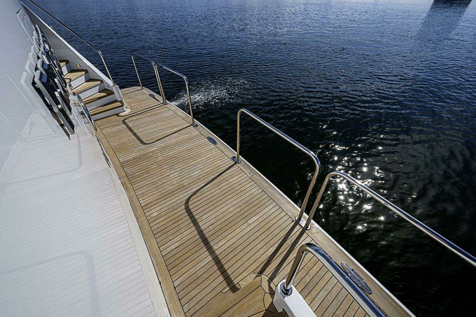 The teak overlay decks of the swim step are protected by removable stainless steel hoop style handrails. There are stainless steel pop-up tender cleats provided. A removable powder coated aluminum swim ladder seen stowed in the lazarette can be fitted to sockets in the swim step. The swim step is accessed via transom steps port and starboard with teak treads, stainless steel handrails and deck level lights port and starboard from the aft deck. In the starboard companionway is a handheld shower.