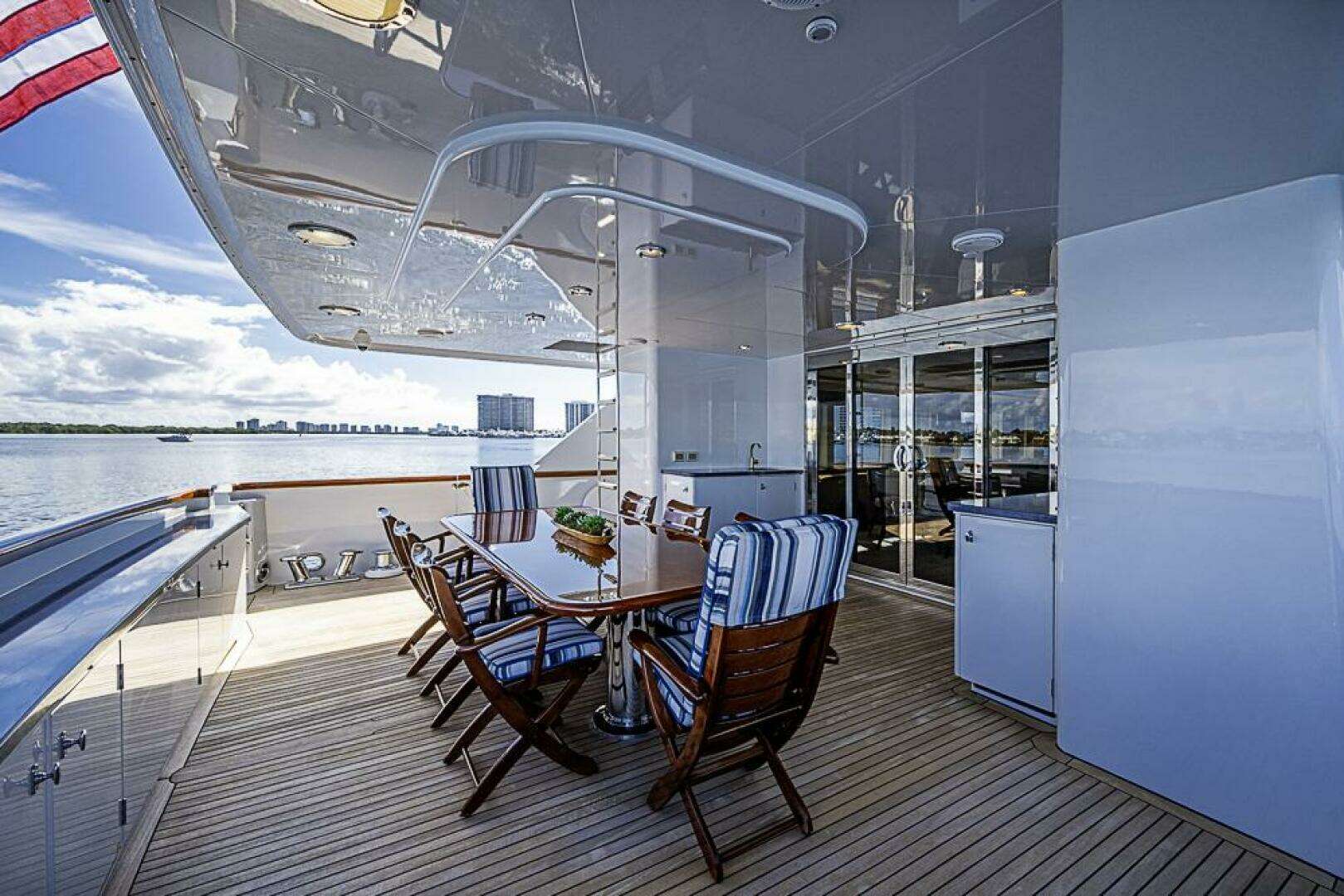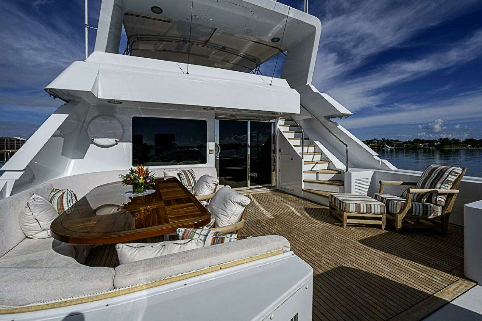 From this vantage point, guests can watch friends and family enjoy the yacht’s full suite of water toys, dive into the ocean from the expansive swim platform, or simply take in the action unfolding around them. Protective covers are provided for the table and folding deck chairs to keep everything pristine.