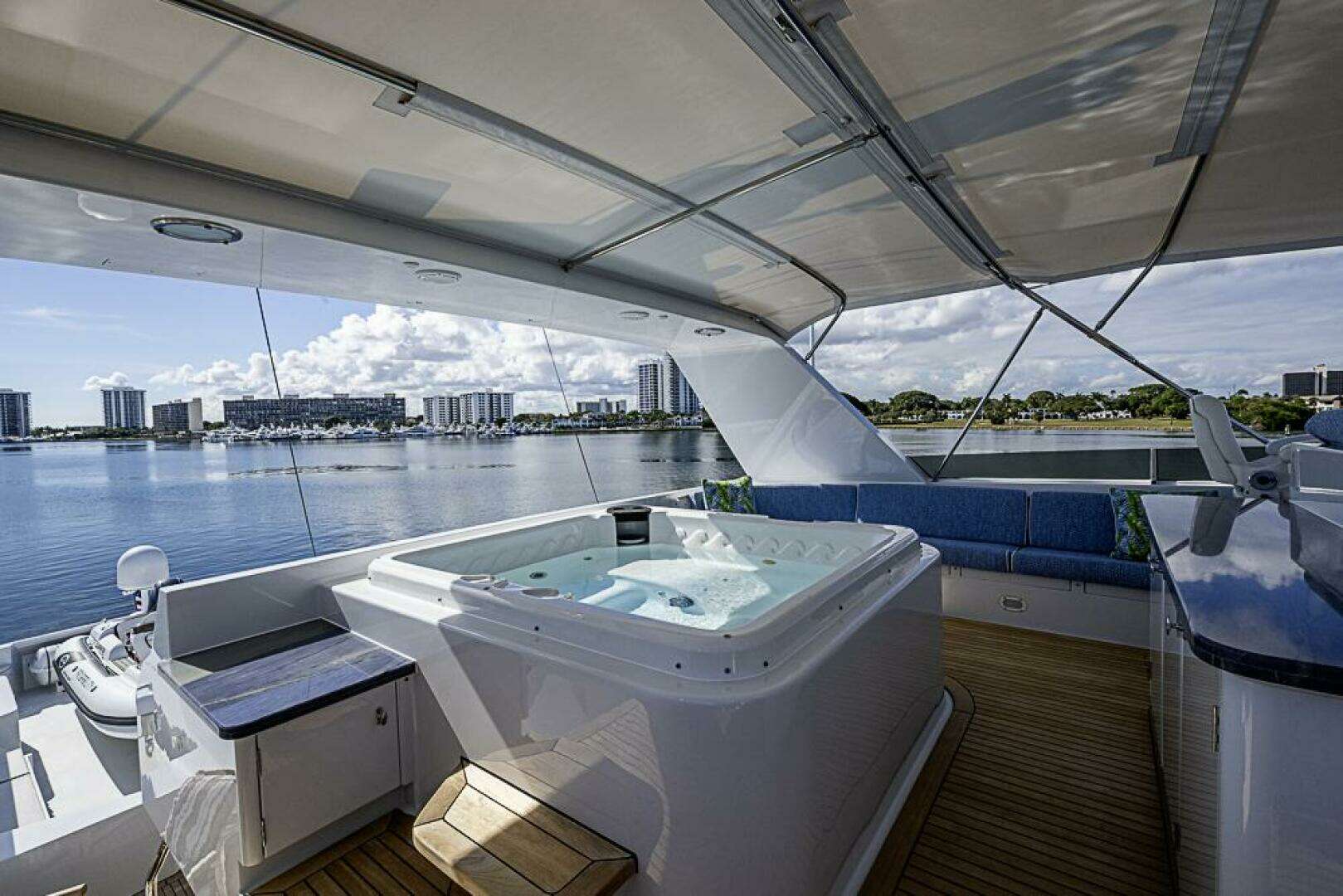 The flybridge deck is an exceptional place to unwind—whether you're soaking in the hot tub at anchor, enjoying cocktails at the bar, or taking in the sweeping views of the ocean from the elevated deck. Painted non-skid decks provide a safe, comfortable surface throughout, while a frameless dark-smoked Plexiglas windshield offers protection from the breeze without interrupting the panoramic views.