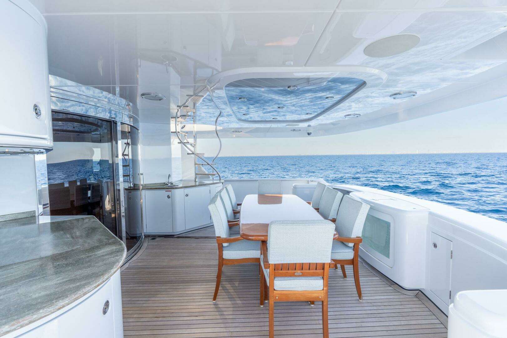 From the swim platform, curved stairways lead up to the aft deck. The sleek transom incorporates both a passerelle and a full docking control station, which remain hidden when not in use, leaving only the elegant curve of the transom accented by a centrally positioned aquarium-style live tank. Armchairs encircle a wooden table, while a well-equipped service bar includes a gas grill and abundant storage. On the starboard side, a curved teak staircase ascends to the upper deck. Thick Plexiglas doors can be closed to block wind, while still allowing access to the side decks.