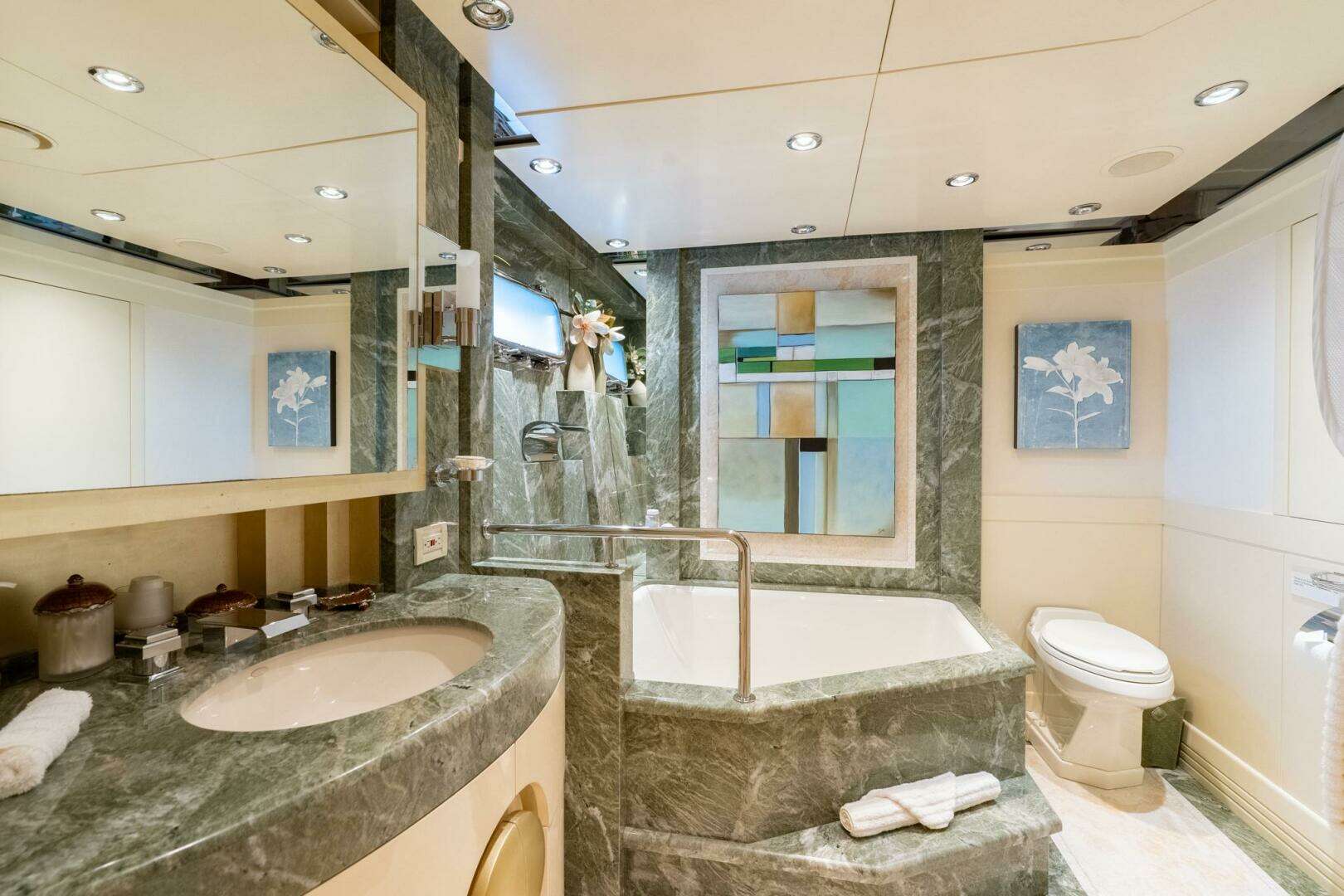 Located across the foyer to starboard, this space includes an underlit glass bowl sink complemented by quartzite accents.
