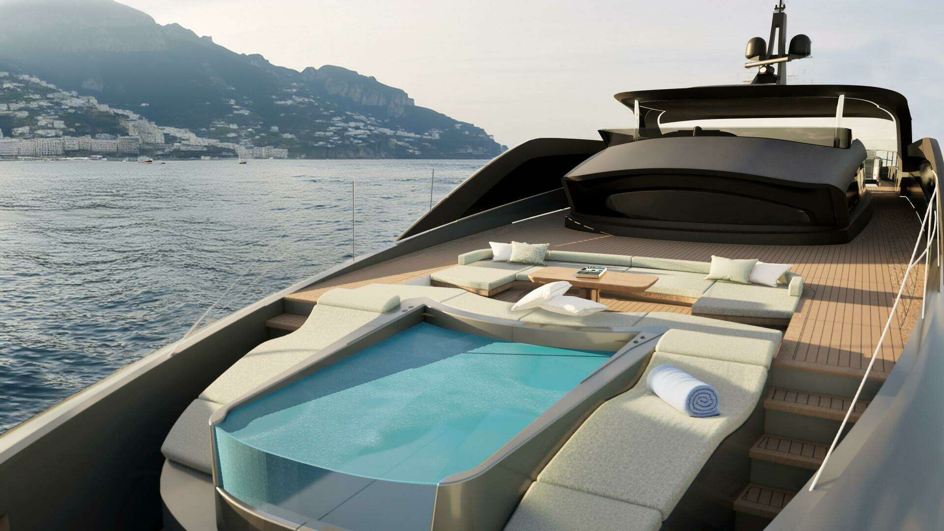 At the stern, fold-down bulwarks open onto the horizon, transforming the aft deck into a spacious terrace over the water. At the bow, a refined jacuzzi offers a place of relaxation, suspended between sky and sea.