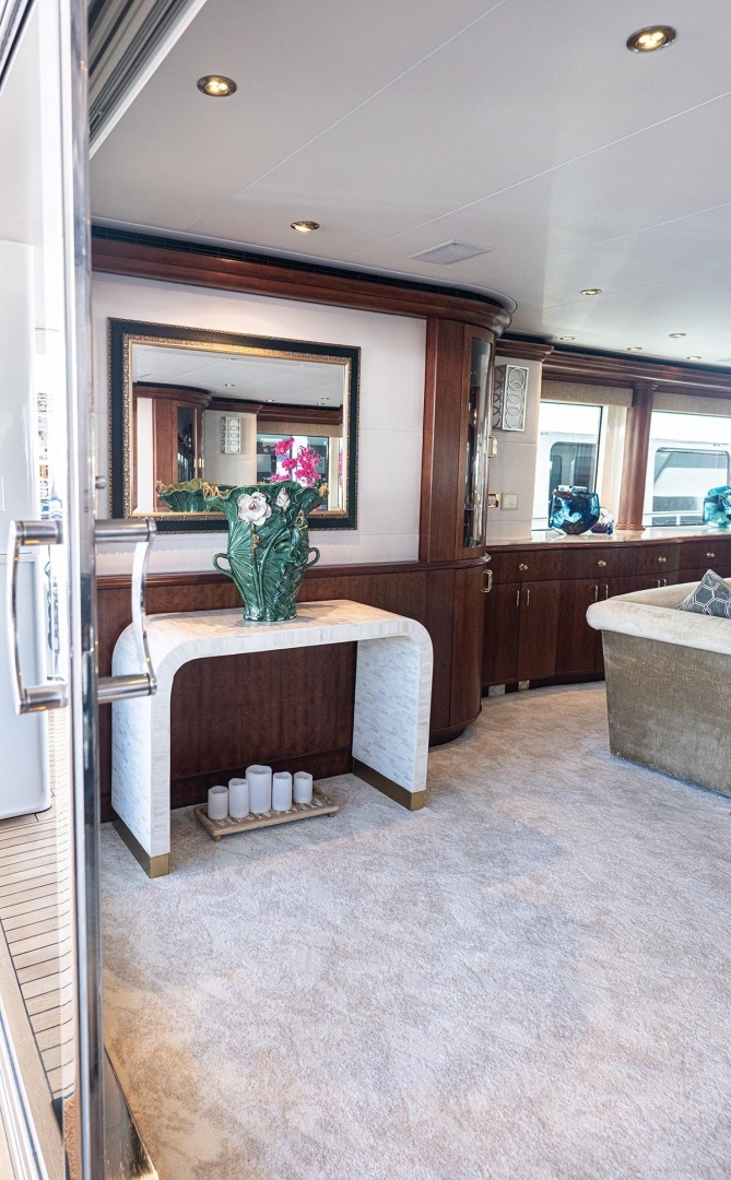 Entrance to the salon is either through double stainless steel sliding glass doors from the aft deck, or through port and starboard sliding Freeman doors from the side decks. The predominant side entrance is to starboard - opening into a porcelain-floored entryway with a stairway down to the guest staterooms and up to the Skylounge. The Owners' cabin, galley, and powder room are forward.