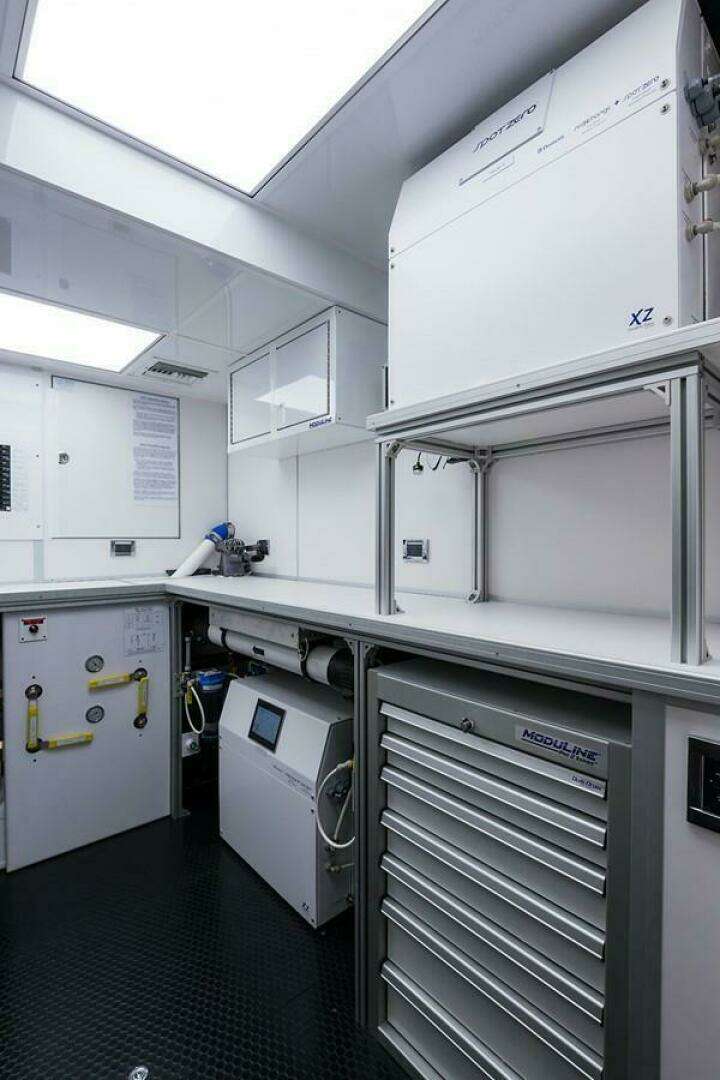 Located off port side of Utility Room, the Equipment Room contains a work bench with sink and vise, Moduline toolbox and tool set, upper storage cabinets, watermakers and bilge pump. Watertight hatch provides access to port Lazarette storage.