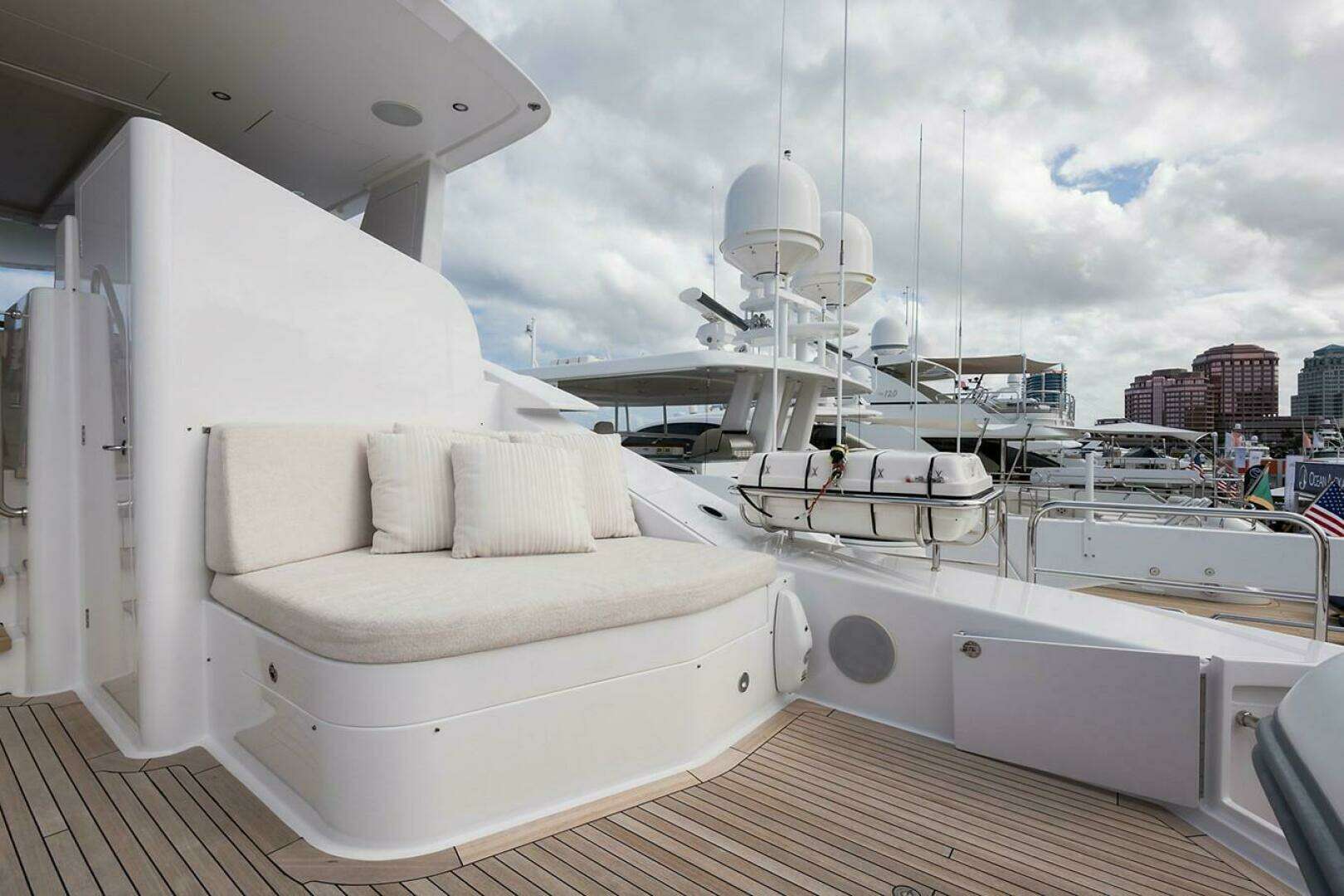 • Swim Step Beach: A Hydraulically actuated sliding platform extends aft from the center of the Swim Step five feet when deployed. The Platform incorporates fold-down swim ladders port and starboard