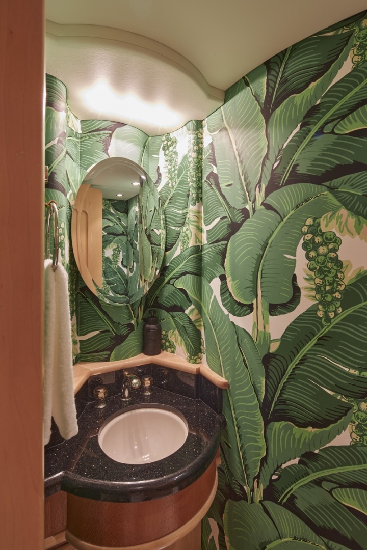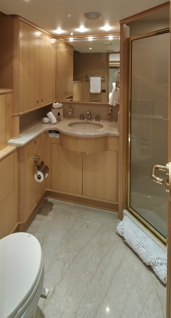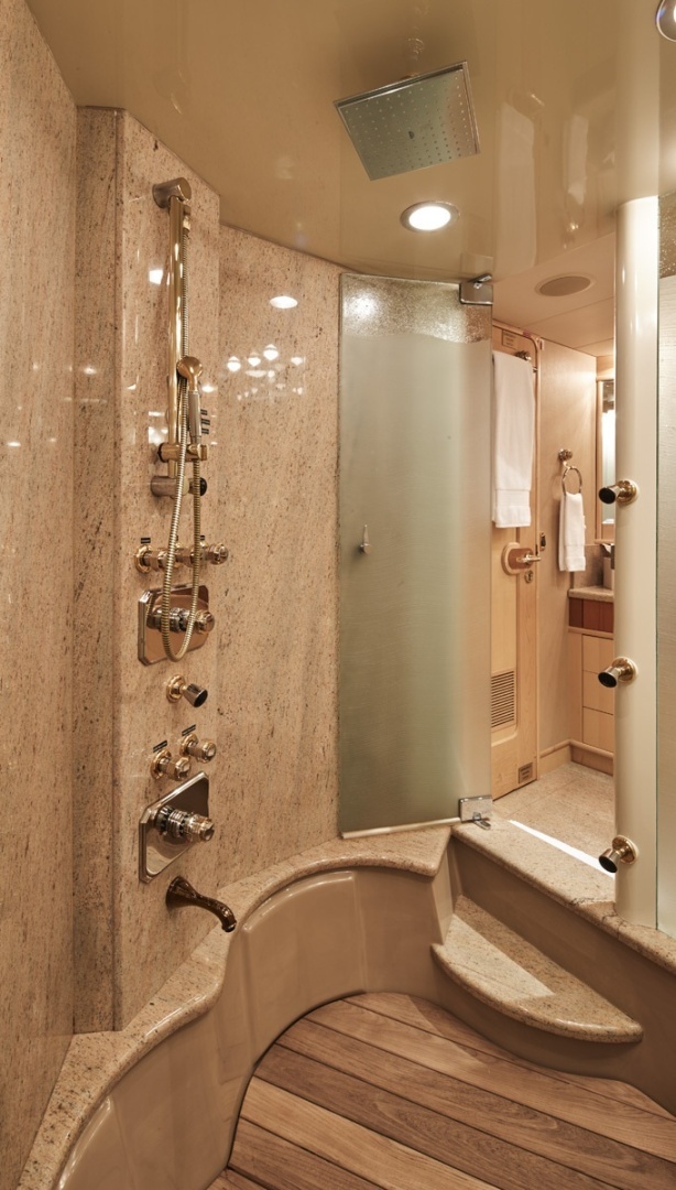 The owner’s stateroom is situated on the main deck forward featuring a unique split level owner’s suite, with the lower lever comprised of a large ensuite including a his-and-her side each with a sink, toilet, bidet, and walk-in closets connected by a large multi-head jacuzzi tub that can also be used as a shower.