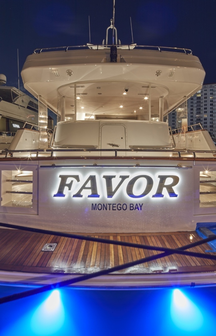 FAVOR comfortably accommodates up to 10 guests overnight in 5 staterooms. She features an open and bright salon with a relaxing lounge area and a formal dining area. The interior is finished in maple wood. Forward of the salon and dining area, to port, is the gourmet galley and stew pantry. The galley is fitted with a cooktop, dual ovens, two sinks, dishwasher, trash compactor, large refrigerators and freezers, as well as plenty of cupboards and drawers. The galley can be open to guests, or a privacy panel can be used to separate the formal dining area from the galley.