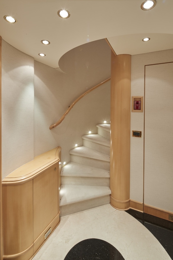 Moving aft and down a separate set of stairs are (2) queen VIP guest staterooms, both with their own ensuites. Further aft, accessed by another private staircase are (2) VIP guest staterooms, (1) VIP guest stateroom with a custom king-size berth, and (1) twin stateroom that can converted into a double bed, both with their own ensuites.