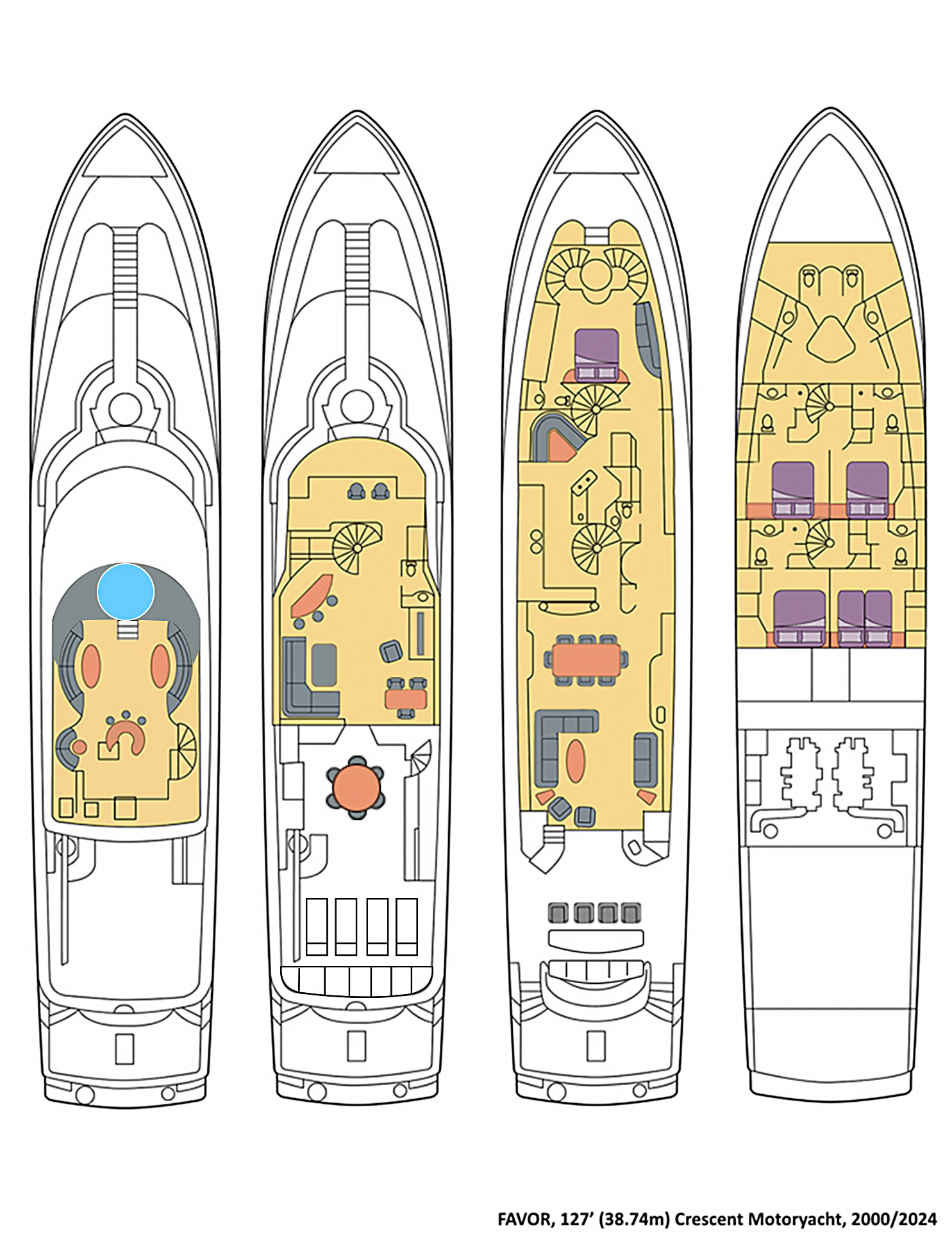 Following a USD 2.0 million refit completed in 2024, this tri-deck motoryacht is presented in exceptional condition, with extensive upgrades throughout. Originally built at 121 feet, FAVOR was professionally extended to 127 feet after construction, creating a significantly larger aft deck and additional crew. She also delivers impressive performance, powered by twin MTU diesel engines that provide both reliability and efficiency.