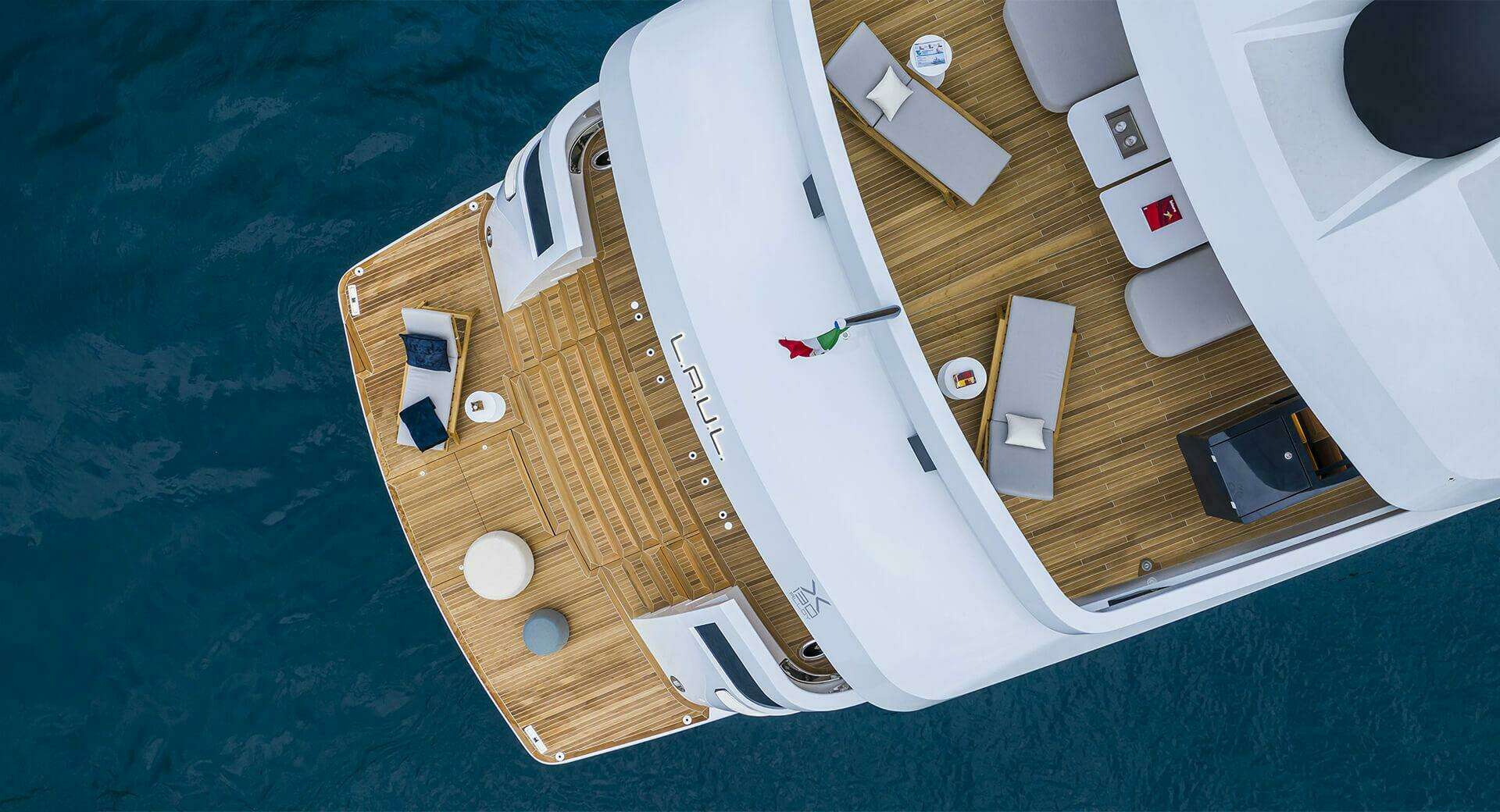 Powered by twin 1800 Hp CAT engines, L.A.U.L reaches 17 knots max, cruises at 12 knots, and has a 4,000 nm range at 9 knots.