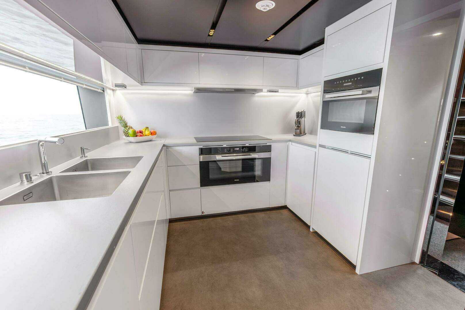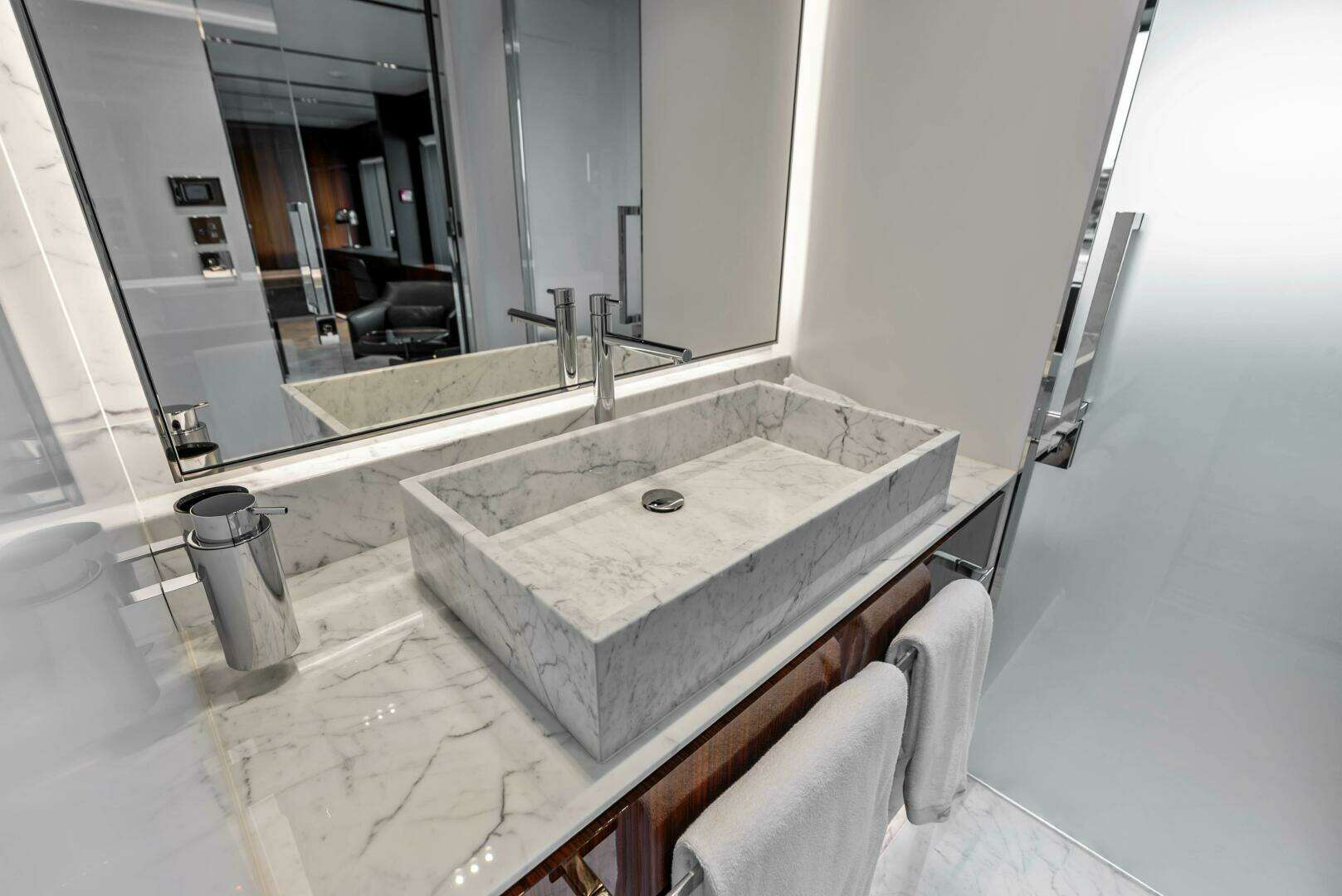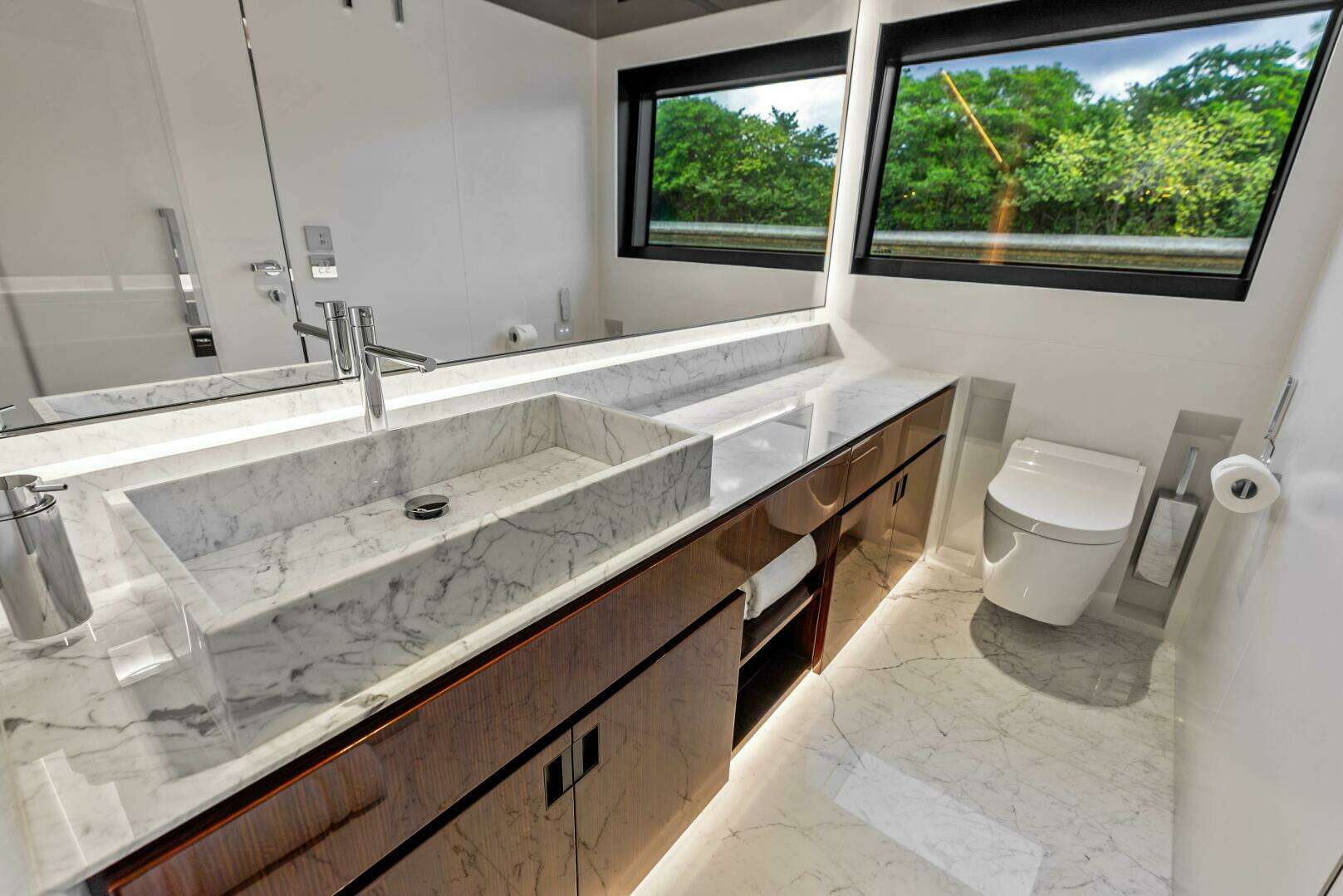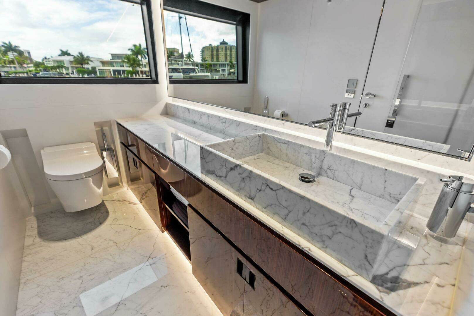 Perhaps the most customized Bellissima on the water today, it is equipped with comprehensive upgrades such as an anti-fouling system, 45” Boning pilot house monitors, custom marble cabinetry and custom wood flooring, SeaDek shelf lining, protective leather surface pads on all rosewood tops, and a tropical air conditioning system extending to all operational and living spaces. The EURO offers both sophisticated comfort and superior, advanced technological capabilities.