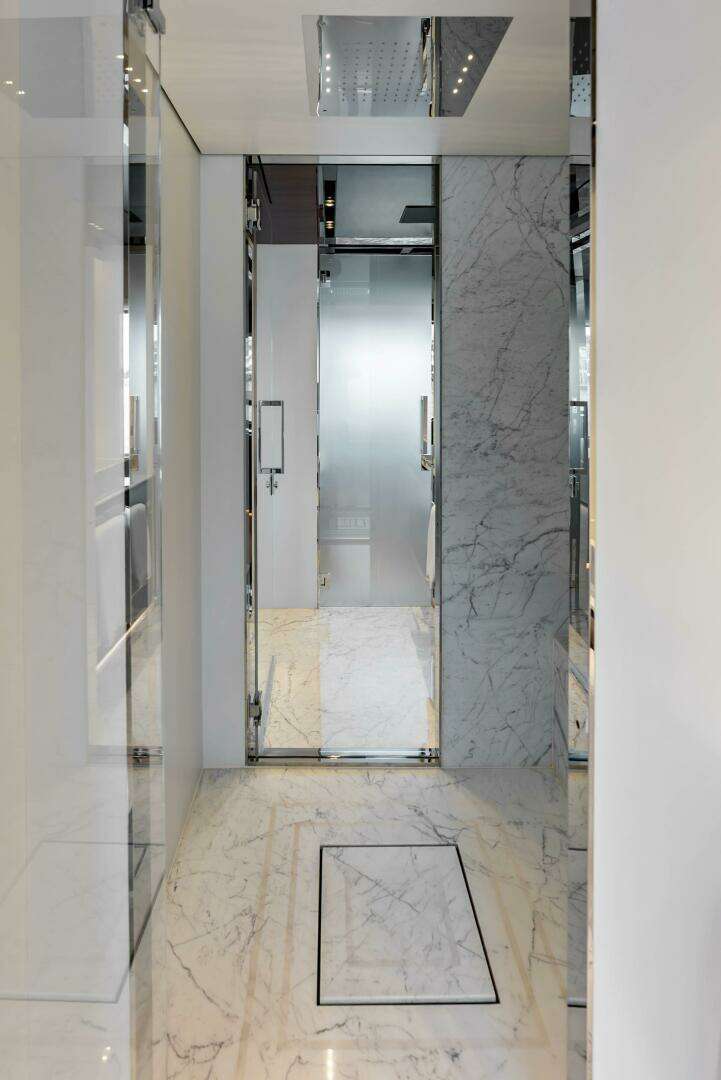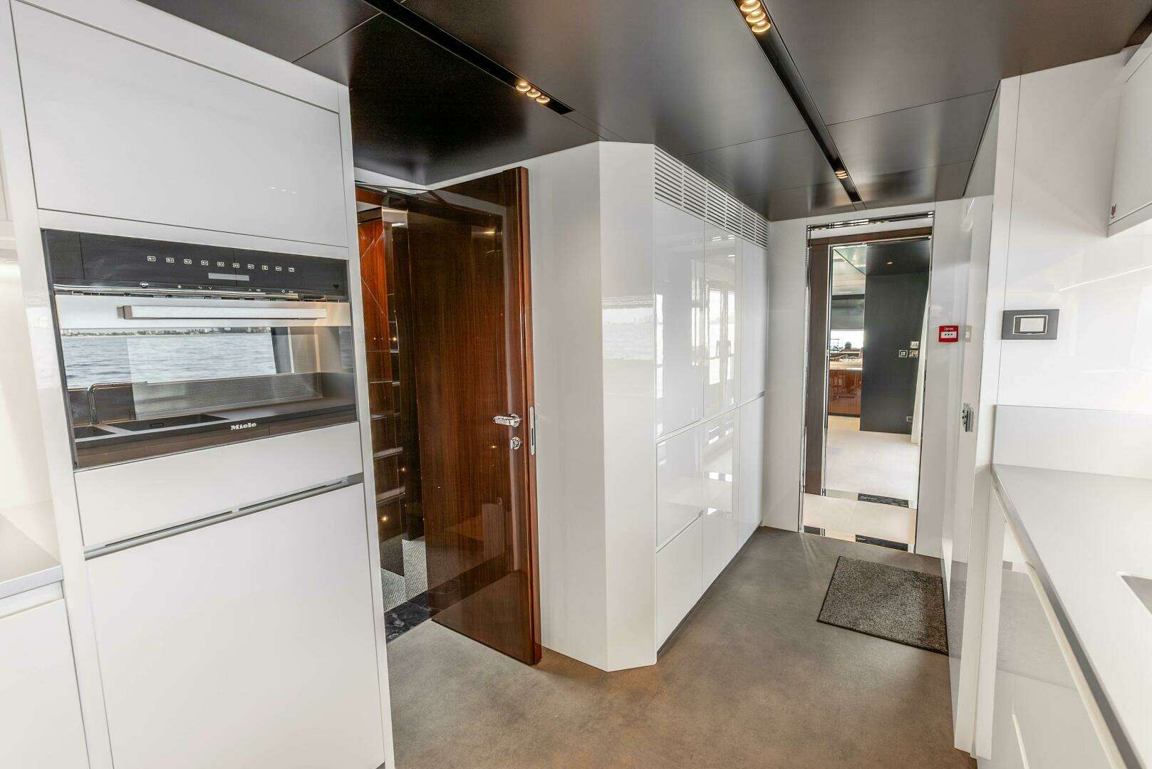 EURO offers three points of entry: port, starboard, and the beach club via passerelle/swim ladder. The aft deck provides access to the beach club, upper deck, and salon. Forward through the electric sliding door lies the salon and dining room, flanked by the master stateroom to starboard and the galley/crew quarters to port.