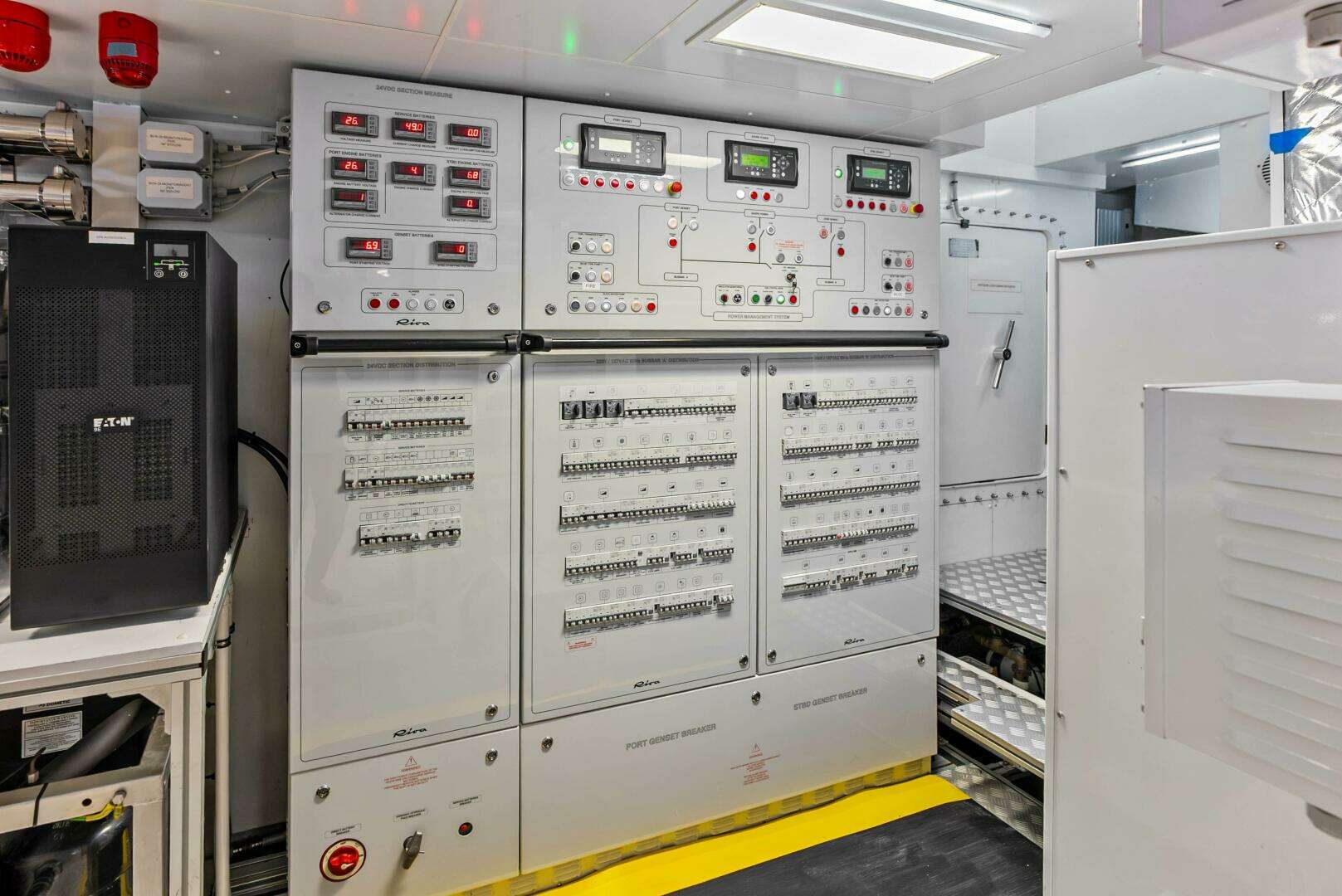 - Control room, generator controls, emergency power, shore connections, alarm systems, batteries, UPS backup system, main switch board