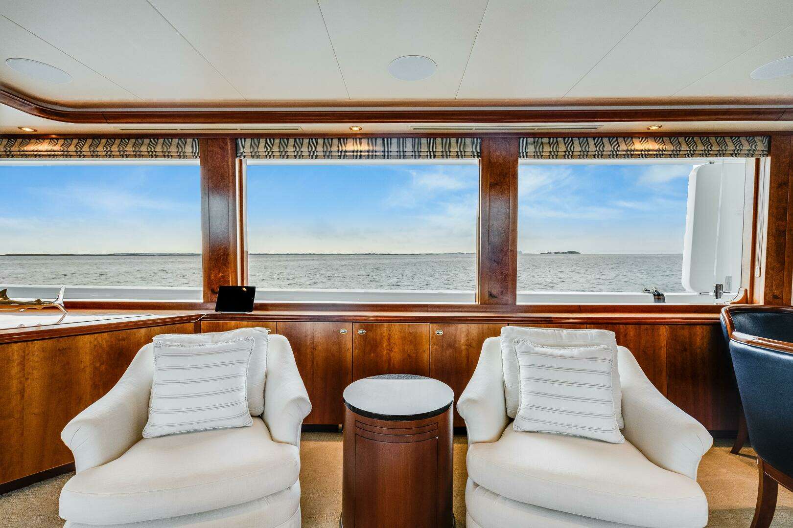 This 130 Westport is ready for her next owner, with her owner's stateroom located forward on the main deck. His/hers ensuites are forward of the queen bed finished with Cherry wood cabinetry, tons of marble and a unique artful glass shower enclosure and a Jacuzzi tub. Cherry wood finishes are used i