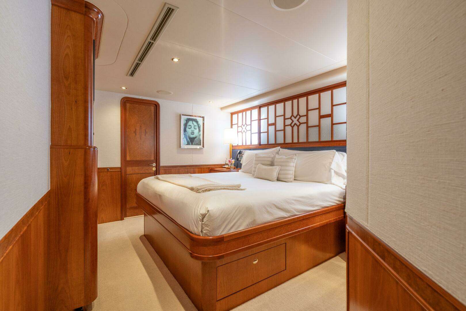 AVALINA accommodates 10 guests across five cabins, featuring a main deck master suite with queen bed and Jacuzzi tub, plus two doubles and two twins on the lower deck. Crew quarters allow for a team of seven. The cherry wood interior offers a warm and timeless aesthetic.