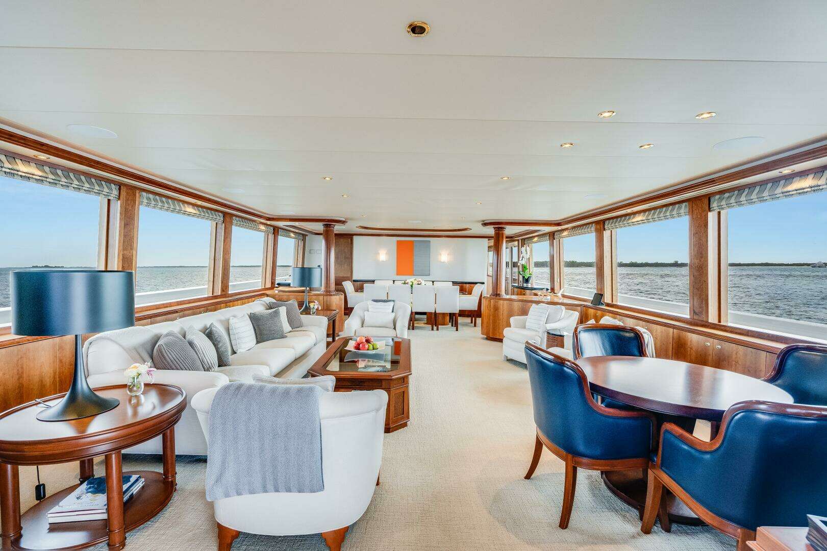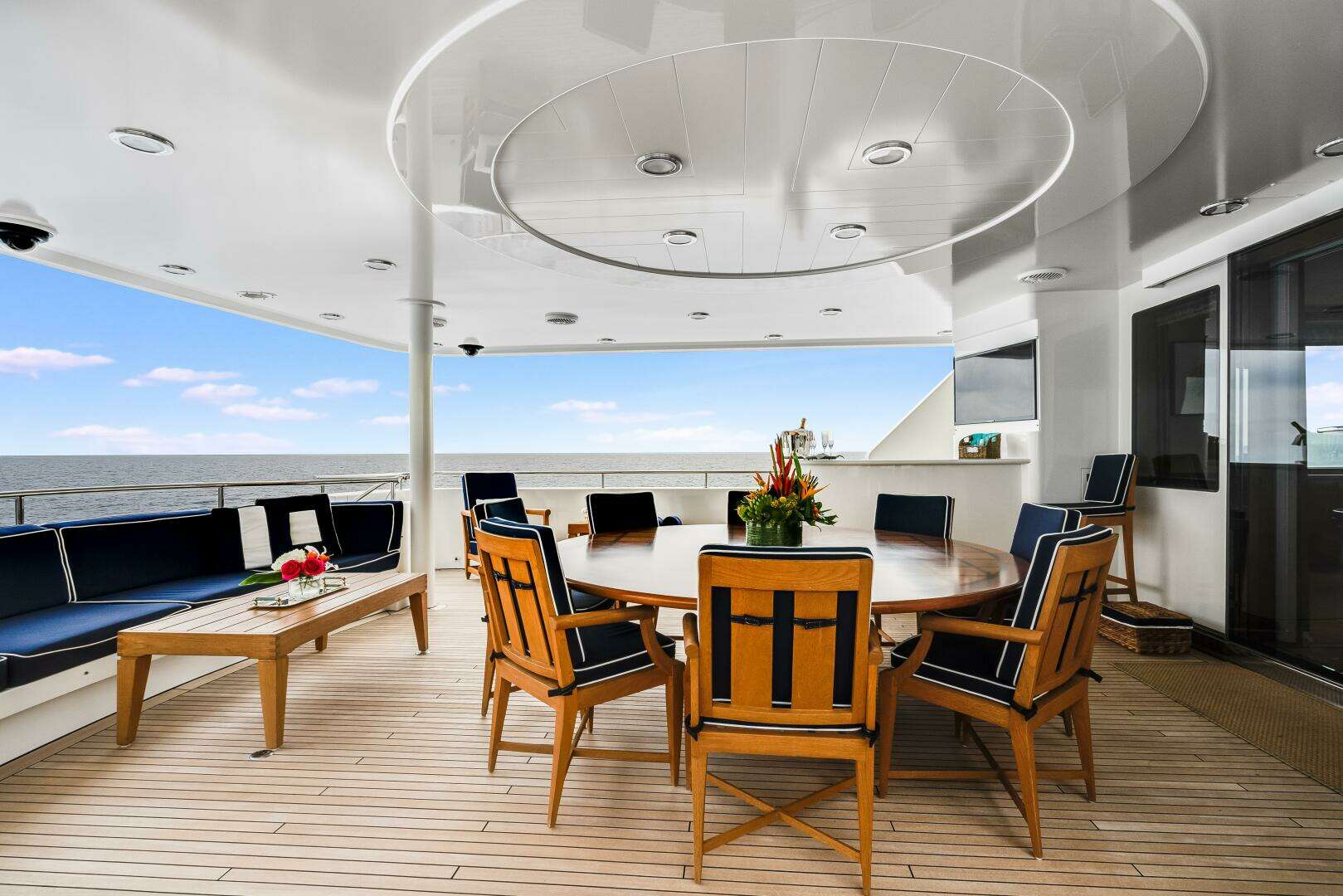 Her layout is designed for both comfort and entertainment, with a spacious main salon and separate dining area, a sky lounge with a games table and sit-up bar, and an expansive aft deck with circular dining, wet bar, and lounge seating. On the sundeck, guests can enjoy a Jacuzzi and sun pads with panoramic views.