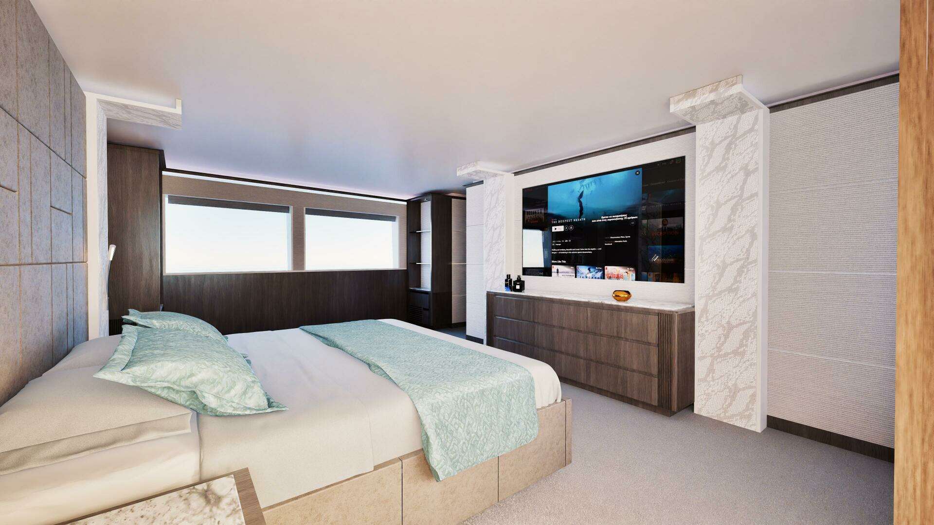 The yacht features six full cabins, including an expansive on-deck owner’s suite and king beds in all guest cabins. All interiors are hand-crafted, not CNC machined, allowing for precise joinery, superior sound control, and a level of finish consistent with traditional large-yacht craftsmanship.