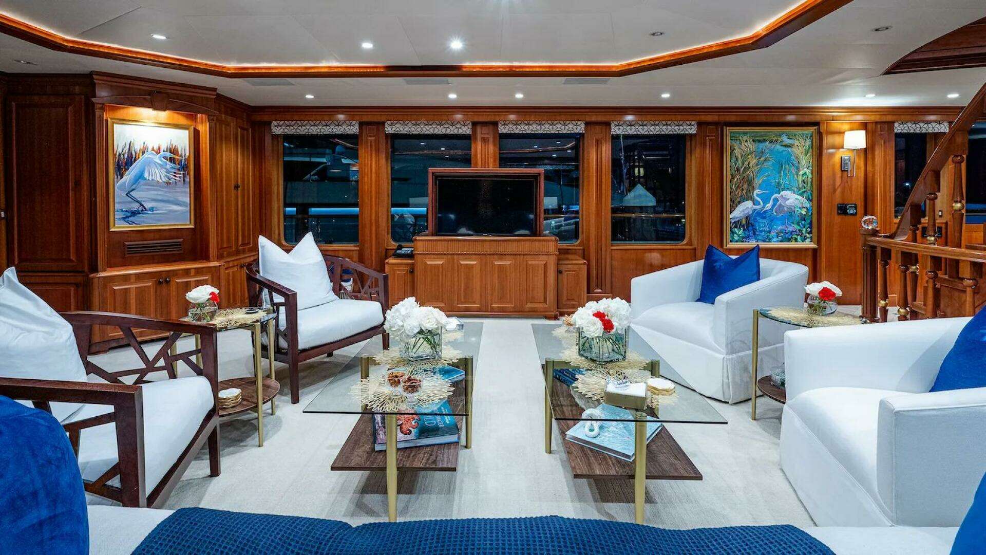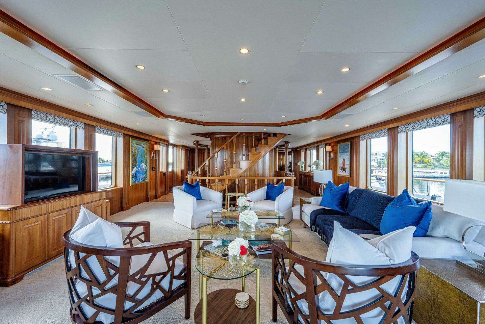 The main salon has a generous sofa, four armchairs, and two coffee tables- perfect for evening cocktails or relaxed conversations. A pop-up TV is discreetly positioned to port.