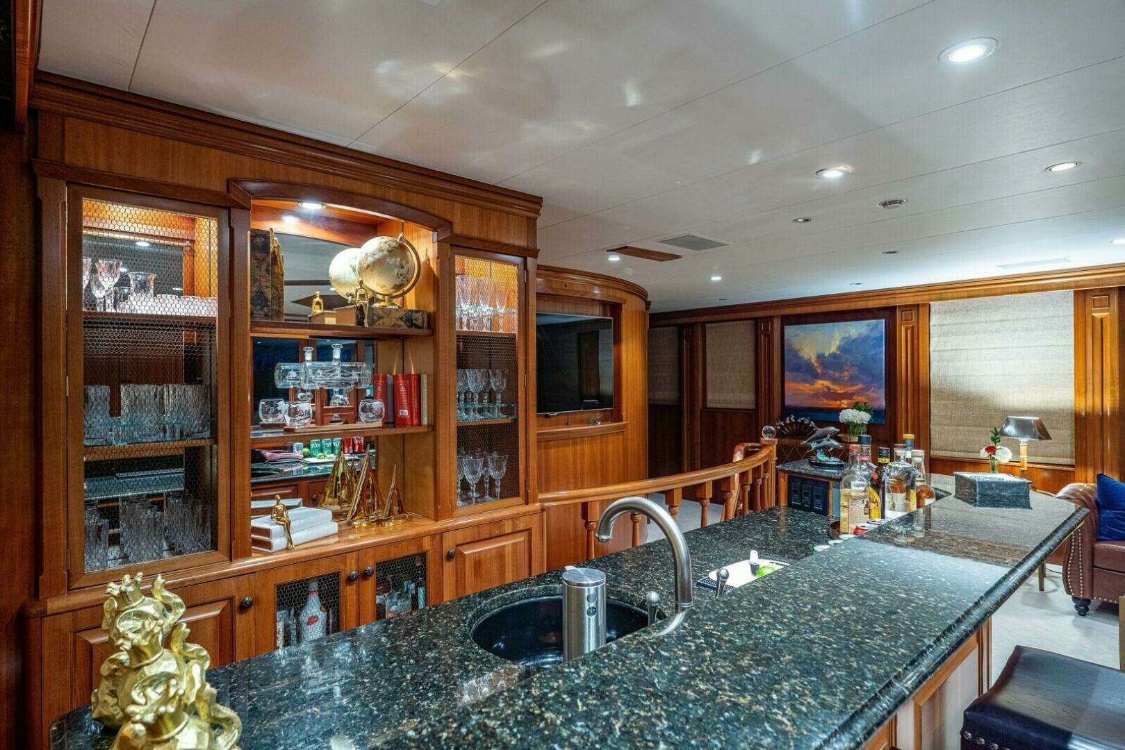 The yacht’s interior showcases rich wood paneling and elegant detailing throughout, creating a warm and inviting ambiance. The full-beam Owner’s Suite is positioned forward on the main deck and features expansive his-and-hers bathrooms, complete with a central Jacuzzi tub and oversized shower—delivering a true retreat experience. Below, three spacious Queen staterooms and one Twin cabin offer en suite accommodations for family and guests.